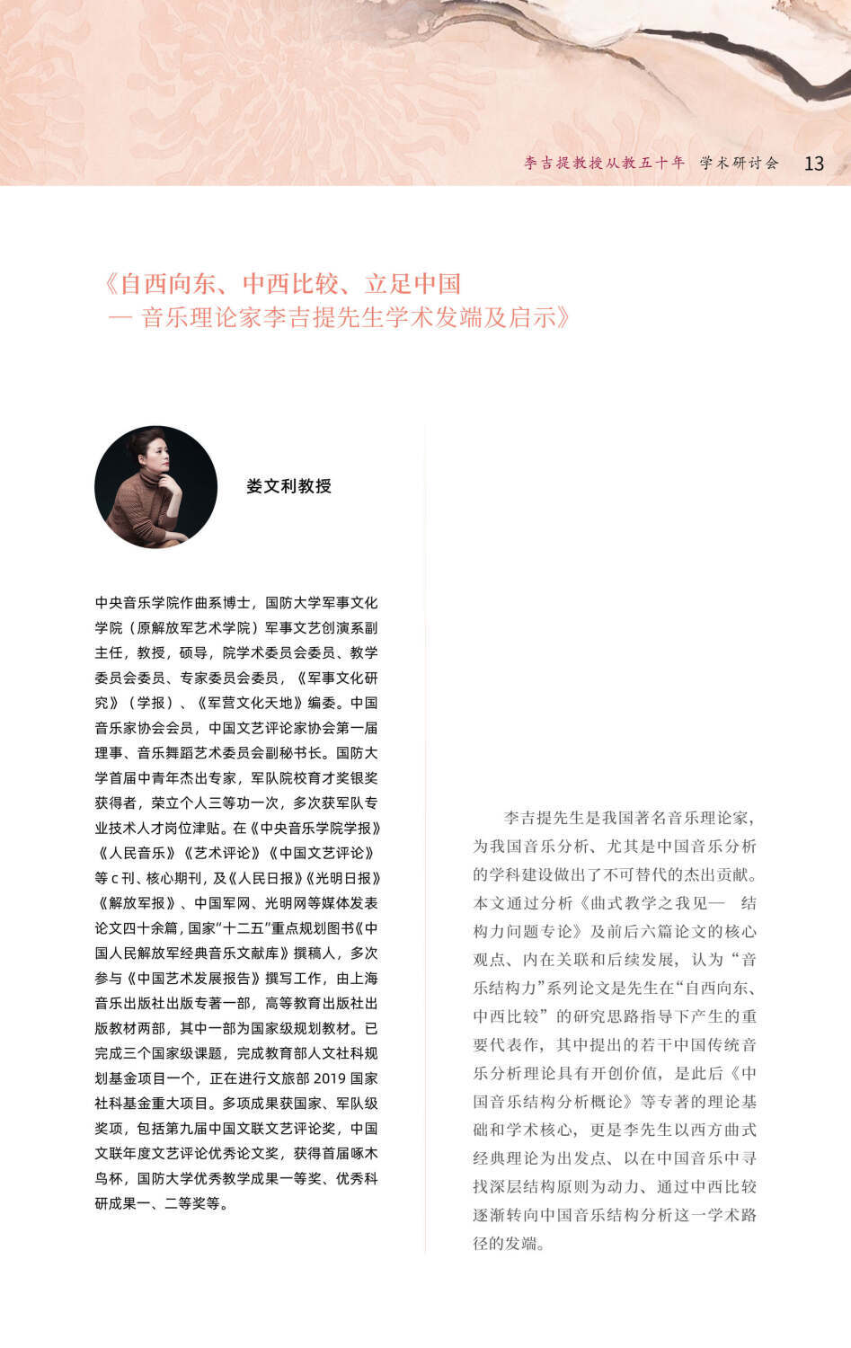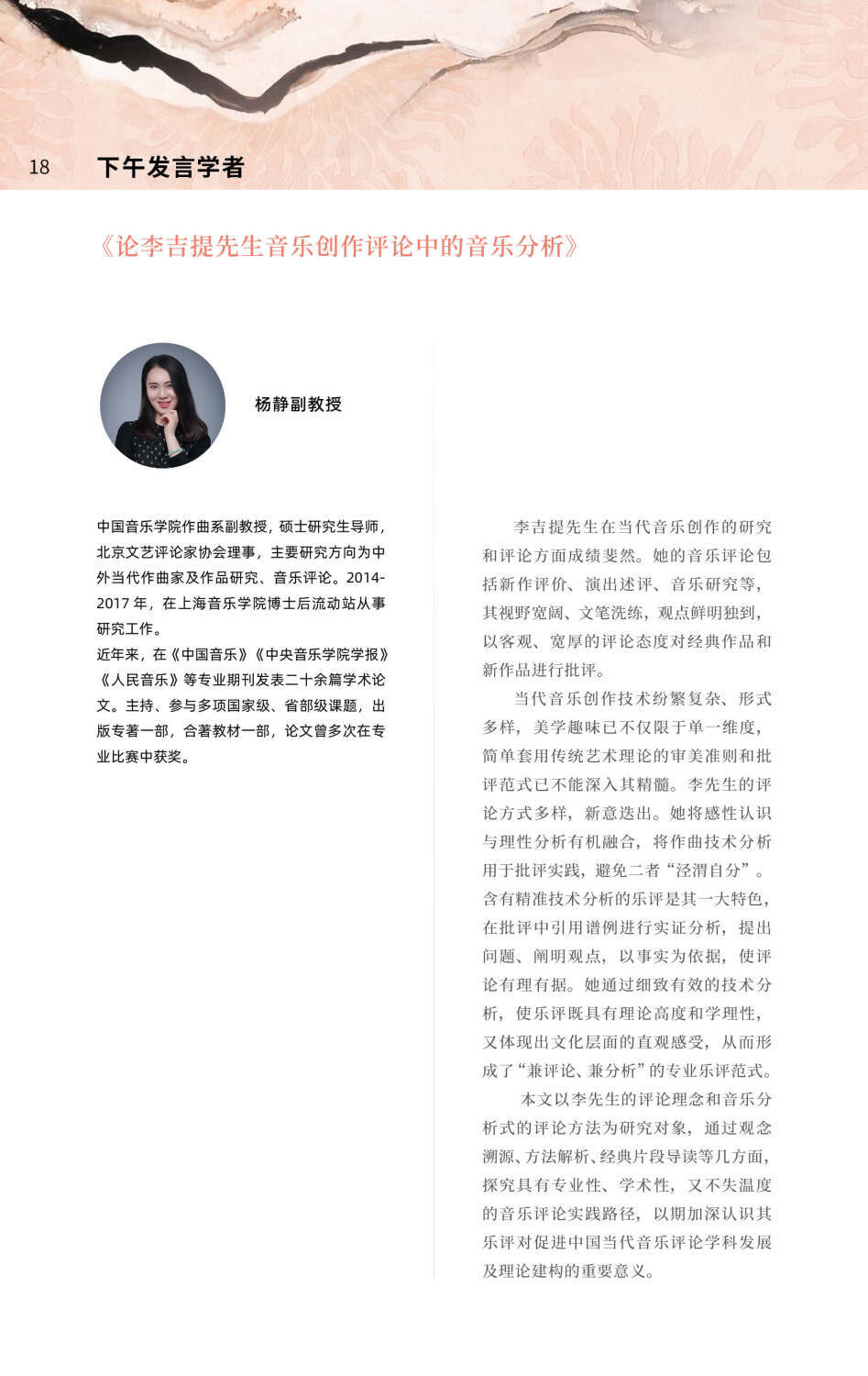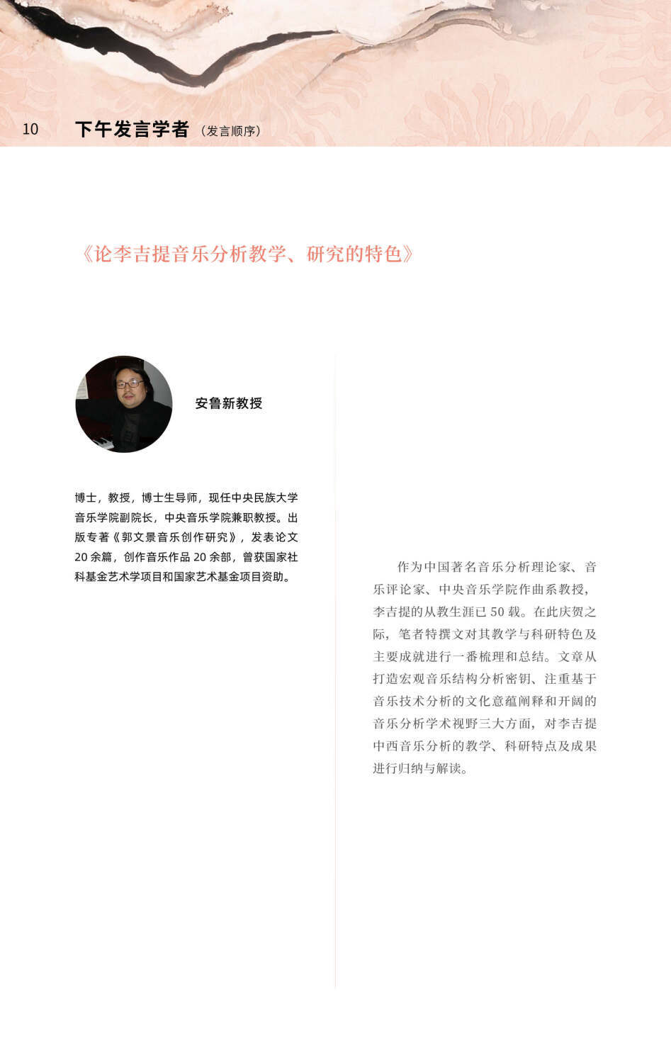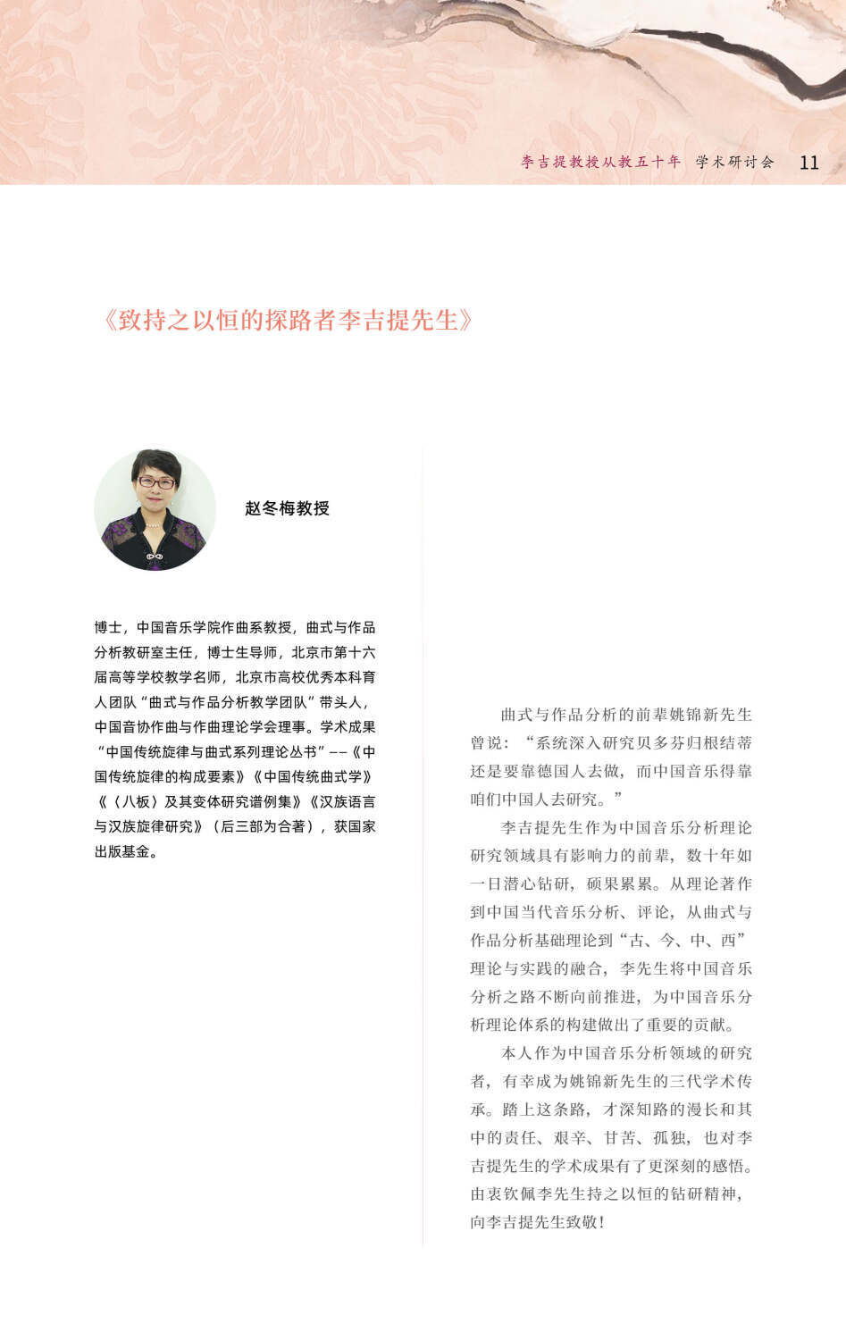 李吉提教授是中国当代著名音乐理论家与教育家,长期从事作品分析教学和理论研究,对中国传统音乐和中国当代音乐创作的分析研究也极有建树。李吉提教授是国务院政府特殊津贴获得者,曾任AC米兰中文官网作曲系副系主任、作品分析教研室主任和博士生导师。出版《中国音乐结构分析概论》《中国当代音乐分析》及《曲式与作品分析》教程等。先后在AC米兰中文官网学报、《音乐研究》和《人民音乐》等刊物上发表过百余篇音乐论文。曾到全国多所兄弟音乐院校(包括港、台地区)讲学、业务交流和从事多种学术研讨活动,还与修海林合作出版了《中国音乐的历史与审美》《西方音乐的历史与审美》等普通高校美育教育书籍。与卞祖善一起为中央电视台“广播电视大学”的“中国音乐名家名作”课程编写录制课件、并成套演播。近年来还参与了米兰国家重点课题“中国歌剧重大问题研究”的子课题写作。2021年获中国民族管弦乐学会颁发的奖杯和“民乐艺术终身贡献荣誉称号”。