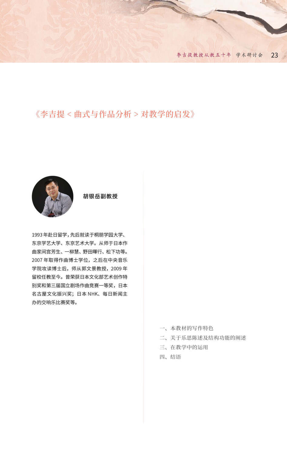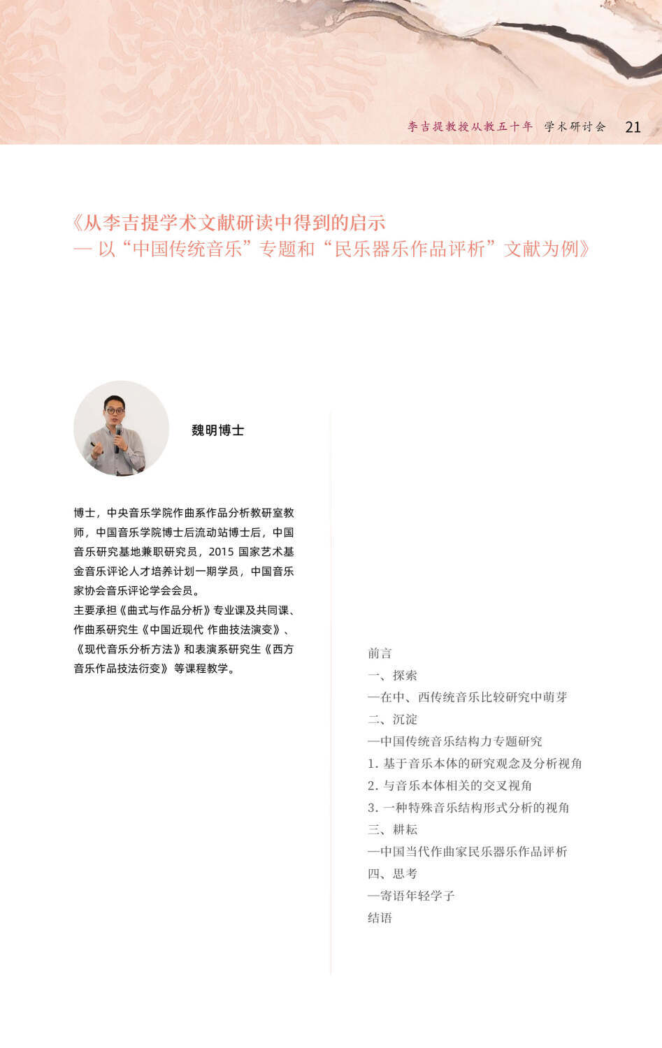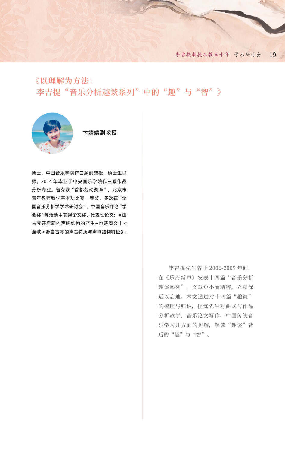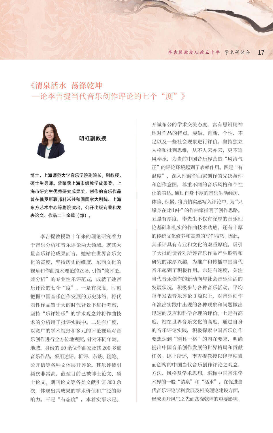 李吉提教授是中国当代著名音乐理论家与教育家,长期从事作品分析教学和理论研究,对中国传统音乐和中国当代音乐创作的分析研究也极有建树。李吉提教授是国务院政府特殊津贴获得者,曾任AC米兰中文官网作曲系副系主任、作品分析教研室主任和博士生导师。出版《中国音乐结构分析概论》《中国当代音乐分析》及《曲式与作品分析》教程等。先后在AC米兰中文官网学报、《音乐研究》和《人民音乐》等刊物上发表过百余篇音乐论文。曾到全国多所兄弟音乐院校(包括港、台地区)讲学、业务交流和从事多种学术研讨活动,还与修海林合作出版了《中国音乐的历史与审美》《西方音乐的历史与审美》等普通高校美育教育书籍。与卞祖善一起为中央电视台“广播电视大学”的“中国音乐名家名作”课程编写录制课件、并成套演播。近年来还参与了米兰国家重点课题“中国歌剧重大问题研究”的子课题写作。2021年获中国民族管弦乐学会颁发的奖杯和“民乐艺术终身贡献荣誉称号”。