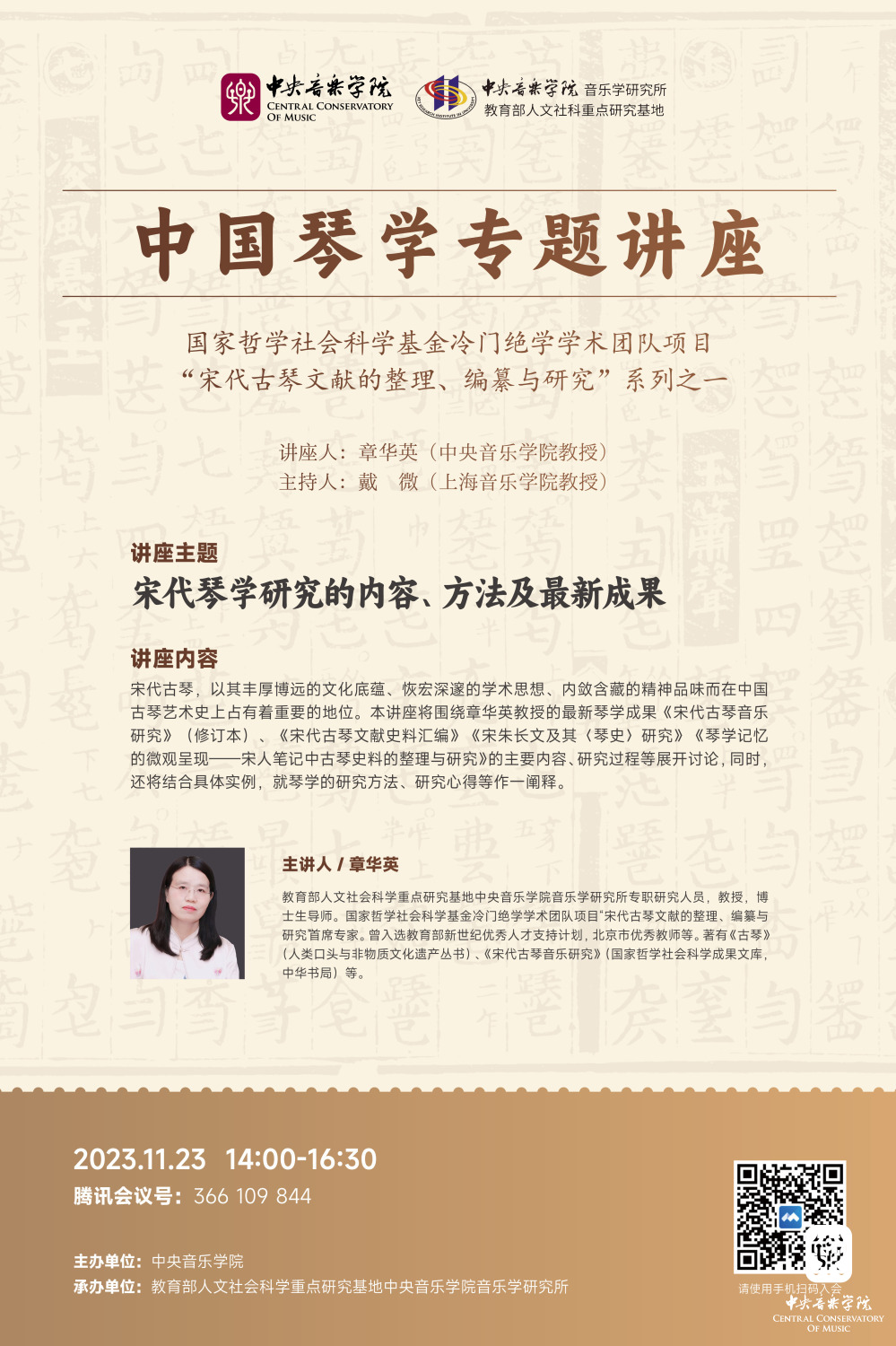 本次专题讲座主要阐释章华英教授近年来在宋代琴学方面的最新研究成果及研究心得、研究方法等。今后,本所还将陆续推出国内外知名琴家、学者的琴学专题讲座。
