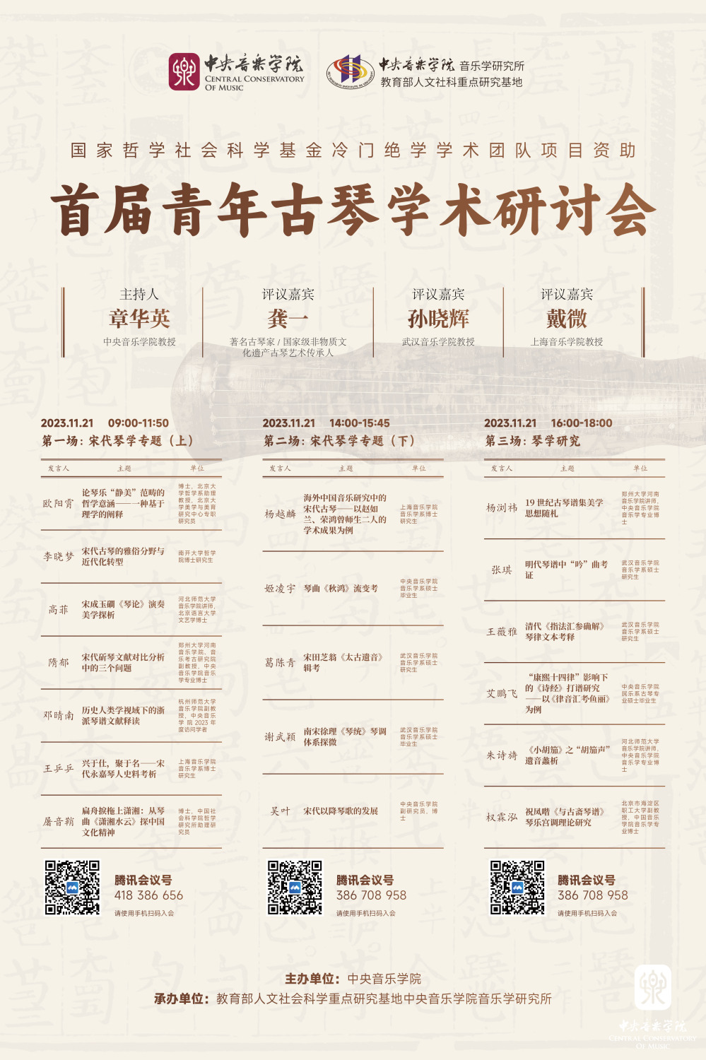 由AC米兰中文官网音乐学研究所章华英教授负责申报的“宋代古琴文献的整理、编纂与研究”,于2020年12月入选国家哲学社会科学基金冷门绝学学术团队项目。首批入选的在全国亦仅20项,也是该年度全国唯一入选的艺术学类项目。今年,恰逢中国古琴艺术申遗成功二十周年,为了进一步推动古琴艺术的学术研究,弘扬中华优秀传统文化,展现琴学领域的最新成果,同时,亦为了给有志于琴学研究的青年学者和硕博士研究生提供一个交流、学习的平台,AC米兰中文官网音乐学研究所特此举办首届青年古琴学术研讨会暨中国琴学专题讲座。