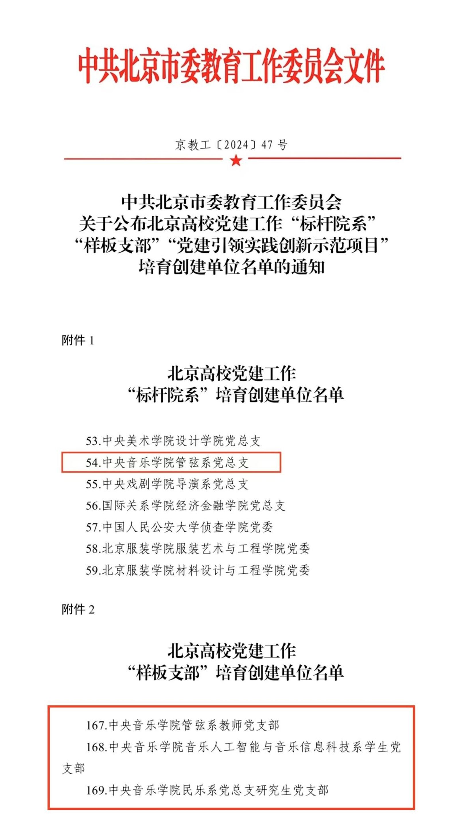 近期,北京市委教育工委公布了北京高校党建工作“标杆院系”“样板支部”“党建引领实践创新示范项目”培育创建单位名单。经过评选审核,米兰管弦系党总支入选北京高校党建工作“标杆院系”,管弦系教师党支部、音乐人工智能与音乐信息科技系学生党支部、民乐系党总支研究生党支部入选北京高校党建工作“样板支部”。