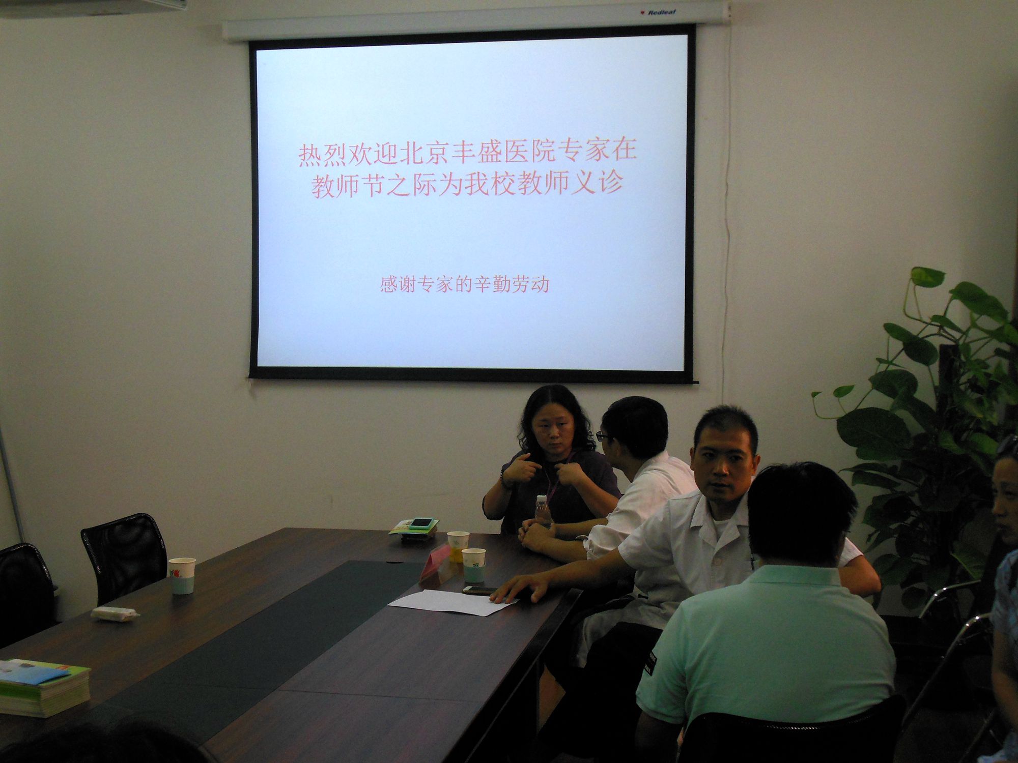 2016年9月6日北京丰盛医院大夫一行8人前来我院为学院教职工提供免费骨科、内科诊疗活动,并进行亚健康调研,普及健康知识。针对由职业病造成的颈椎、腰、腿疼、消化系统等疾病做一些辅助的理疗、按摩、点穴等。