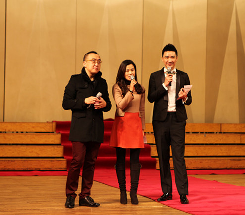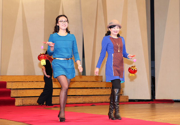 而后民俗协会的老师们表演了绝活抖空竹、踢毽。各系的辅导员老师们一改往日的严肃形象,也不示弱表演了歌曲串烧,赢得了阵阵喝彩。教务处处长徐之彤老师别有心意的把学院老师的名字串在了《给校友的一封信》里,让大家耳目一新,鼓掌叫好声不时响起,又一次将联欢会推向了高潮。最后一个压轴节目是学院行政、系各部门代表表演的《T台走秀》,节目既展示了各部门的文化与朝气,又给了一直在幕后为学院发展默默奉献的行政老师们一次舞台展示的机会。虽然在镁光灯下老师们的神情略显紧张,当展示出部门的对联与横幅时,喜悦兴奋之情溢于言表。