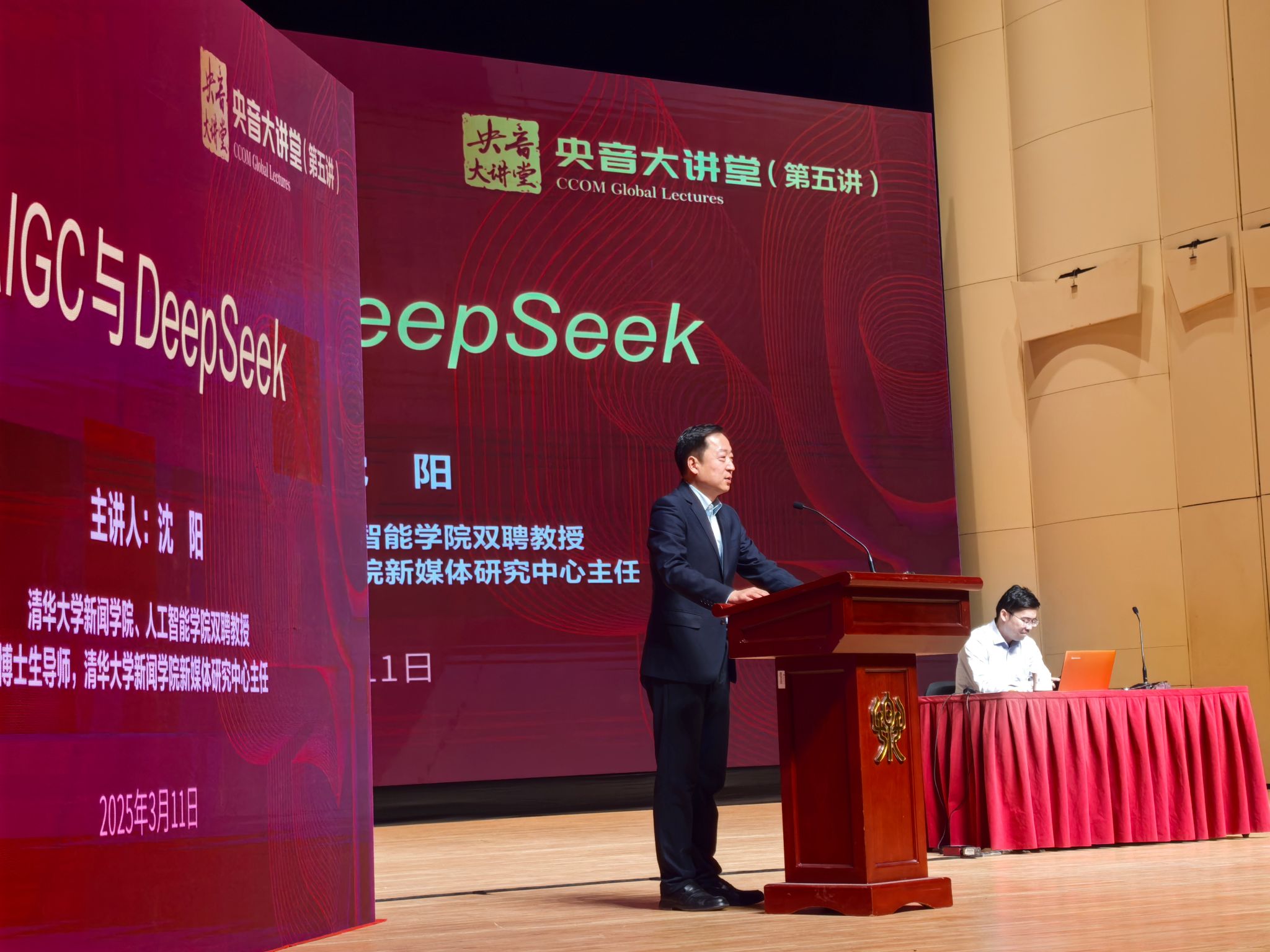 在2025年全国两会期间, 与人工智能有关的DeepSeek、“AI教育”等成为了一个备受关注的话题。沈阳教授(清华大学新闻与传播学院、人工智能学院双聘教授,清华大学新闻学院新媒体研究中心主任)受邀到校主讲本学年度首期“央音大讲堂”——暨“清华大学沈阳教授解析AIGC与DeepSeek技术前沿”。这不仅是一场关于人工智能技术的学术盛宴,更是一场对教育深刻变革的探讨。