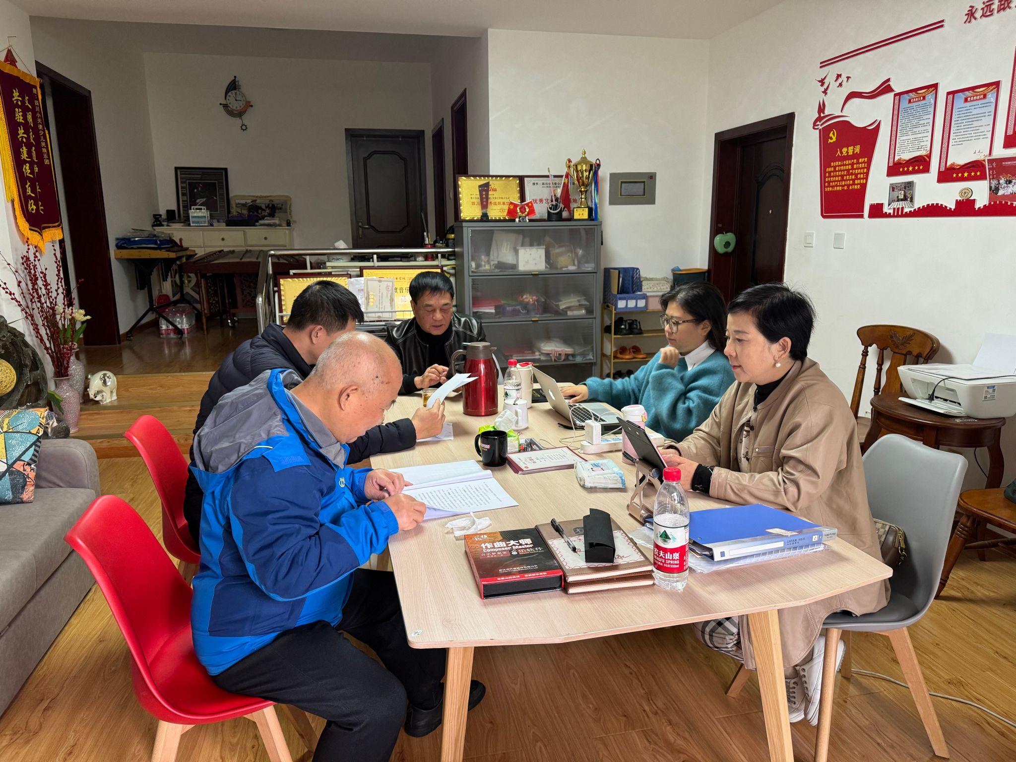 课程结束后,在校教师和赵寒阳教授在会议室进行了简短的会议,对此次公开课进行讨论和总结,面对二胡的普及教育和提升,民乐美育与民族文化自信的培养给予了专业的指导意见,会议最后赵寒阳教授就二胡艺术在北京的发展情况做了简要介绍,并提出在新时代尤其是中国式现代化发展建设进程中,全国各地、各校对于二胡乃至民族音乐的传承与发展,需要每一位教育工作者和有志之士共同努力。