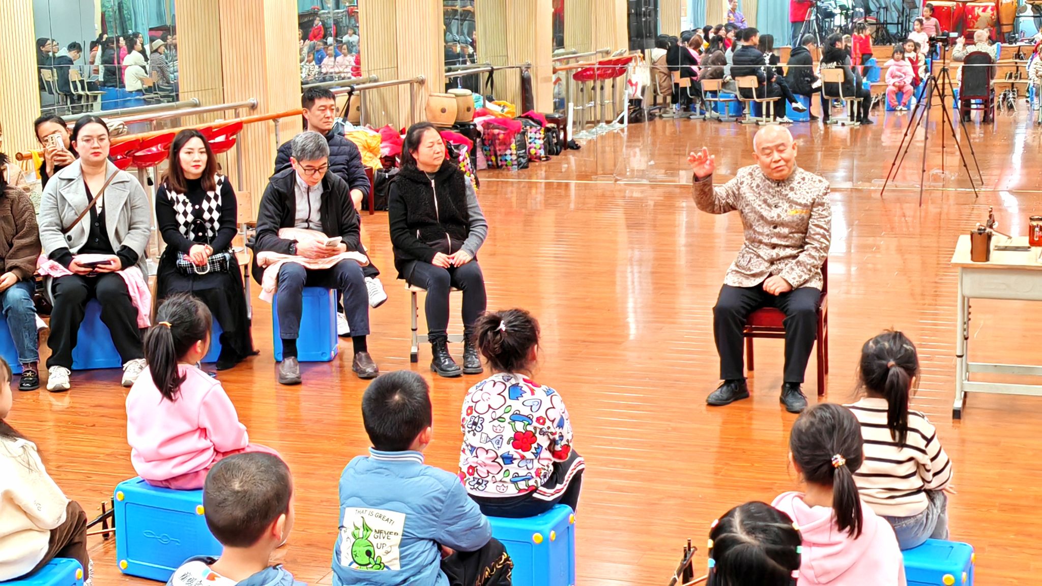 成都玉林附小作为成都市“艺术教育特色学校”和成都高新区“民乐美育实践基地”,市局领导和学校领导对艺术素质教育高度重视,并将二胡作为校本课程,已坚持民乐美育十余载。此次的赵寒阳二胡大师公开课,由一年级二胡大课堂里优选出的30余名学生参与,同时学校的多位教师和学生家长作为旁听,加入到学习中,共同受益。