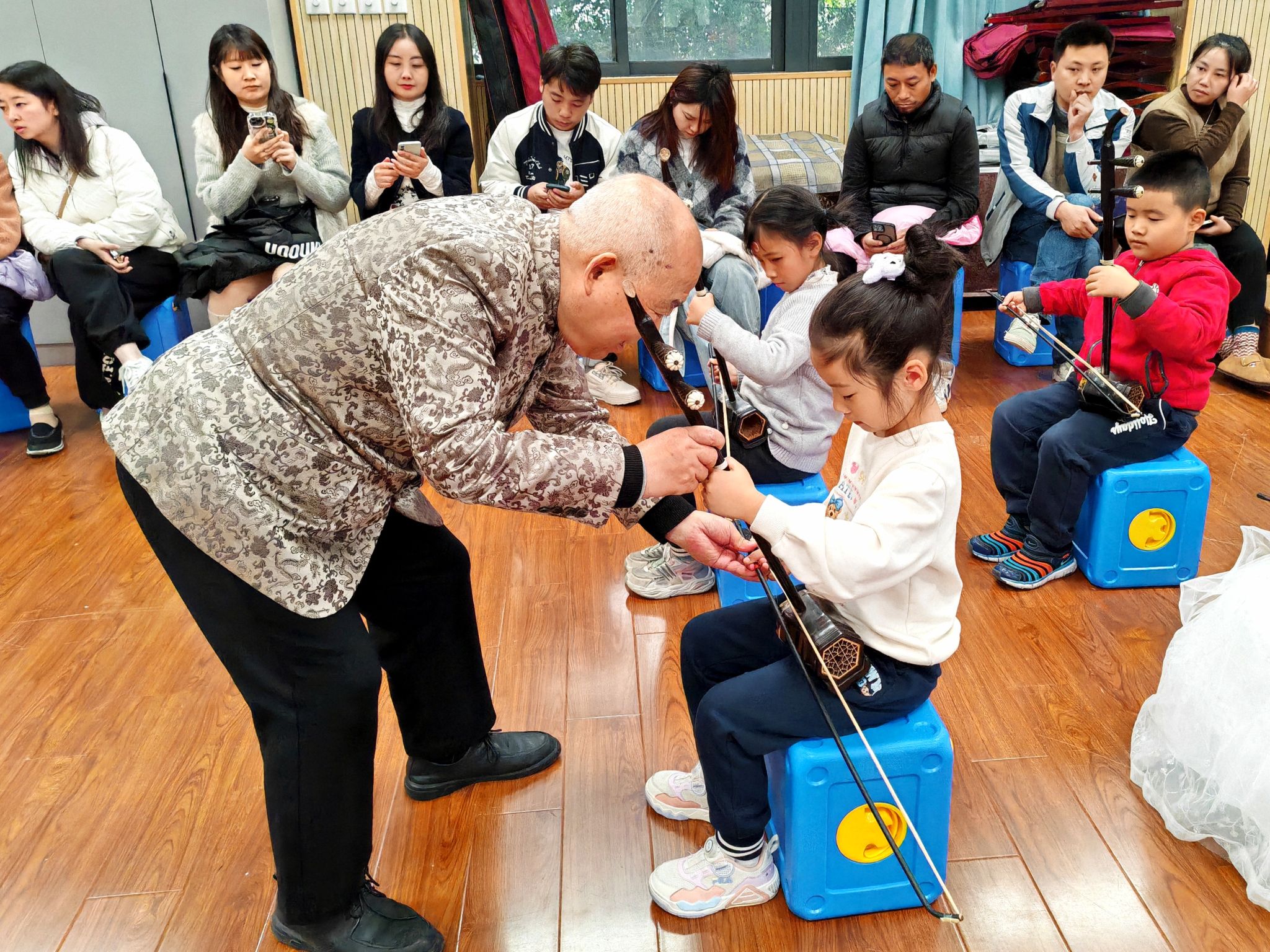 课程的后半段,由学校二胡大课堂的二胡专业老师给学生们上课,运用到赵寒阳教授教导学生时的方式方法,赵寒阳教授一边旁听一边给予针对性指导,并在课后给出更加专业的指导意见,帮助二胡教师提升教学能力。