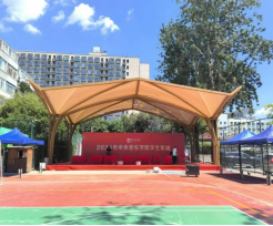 在繁华喧嚣的二环内,米兰以独到的创意与前瞻性的规划,成功将运动与音乐美学的精髓相融合,于运动场东半部巧妙利用垂直空间,构建起一座多功能棚架,其设计巧妙融合了运动活力与音乐韵律,以流线型的结构勾勒出动感十足的轮廓,成为开学之际学生军训时一道引人注目的风景线。同时具备室外会议主席台等多重功能,为各类户外集会、讲座及文化活动提供了理想的场所。这里将见证无数思想碰撞的火花,成为学术交流与文化传播的新高地。