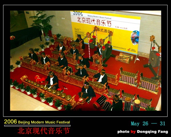 一天的活动中,最引人注目的是于下午5时开始的开幕酒会。一支来自印度尼西亚的加美兰乐队用他们独特的民族音乐和特有的礼仪,将参会人员从友谊厅引进演奏厅。能容纳近300人的演奏厅一时间高朋满座,嘉宾云集。他们中有来自全国各地的音乐院校师生,也有从国外专程回来的华裔音乐家,有主办单位的负责人和赞助单位代表,更有音乐界的有关领导和知名人士。开幕酒会由北京现代音乐节艺术总监叶小纲教授主持。期间,领导和嘉宾们纷纷发表祝贺之辞。他们或照稿宣读,或即席发言,都是那么的真挚和精彩。