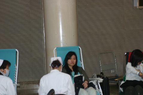 4 月20 日 风和日丽,一扫几天灰暗的浮尘天气。我系学生早早来到学院的琴房楼友谊厅等待献血。