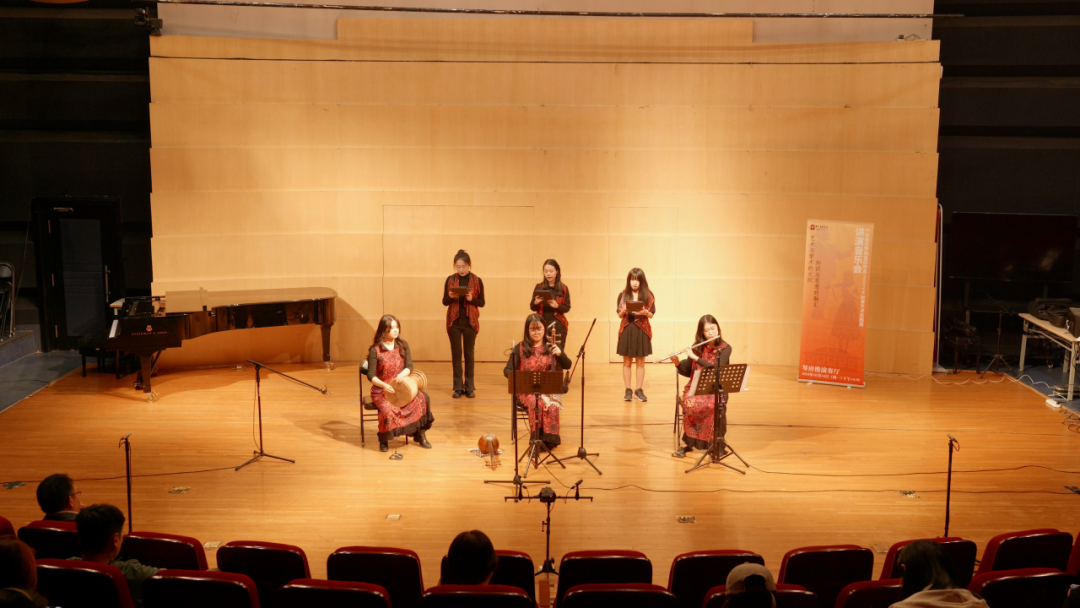 朱珠在演奏韩国传统音乐《挥莫里长短》前,为大家介绍朝鲜族的传统乐器长鼓,以及作品中出现的“长短”节奏模式和衬词的作用,她们的演奏不仅渲染了作品热闹的氛围,也带大家了解到朝鲜族音乐的独特魅力。