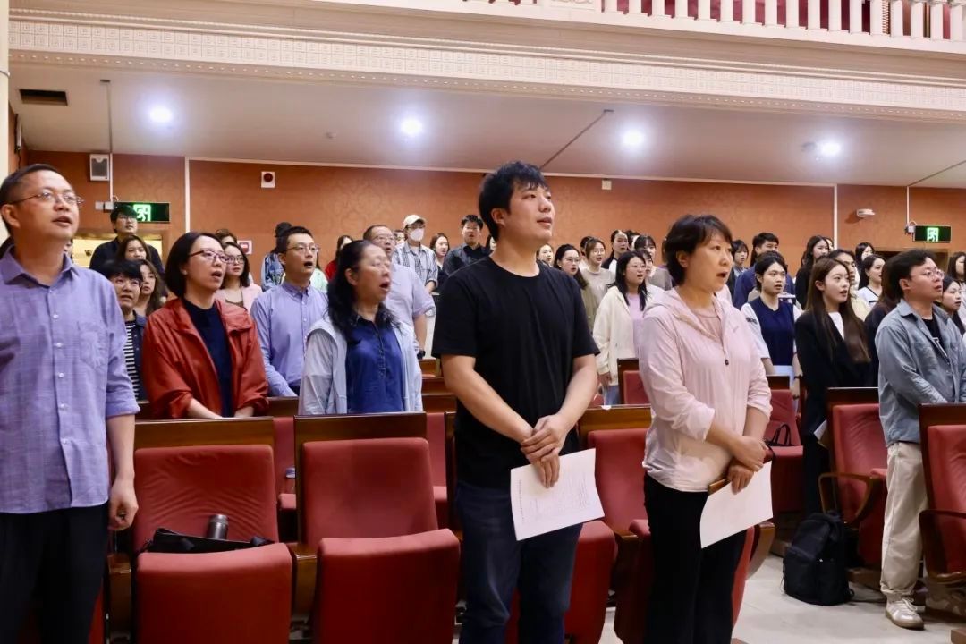 当庄严的乐声响起,音乐学系全体师生全体肃立,共唱国歌,拉开了见面会的序幕。