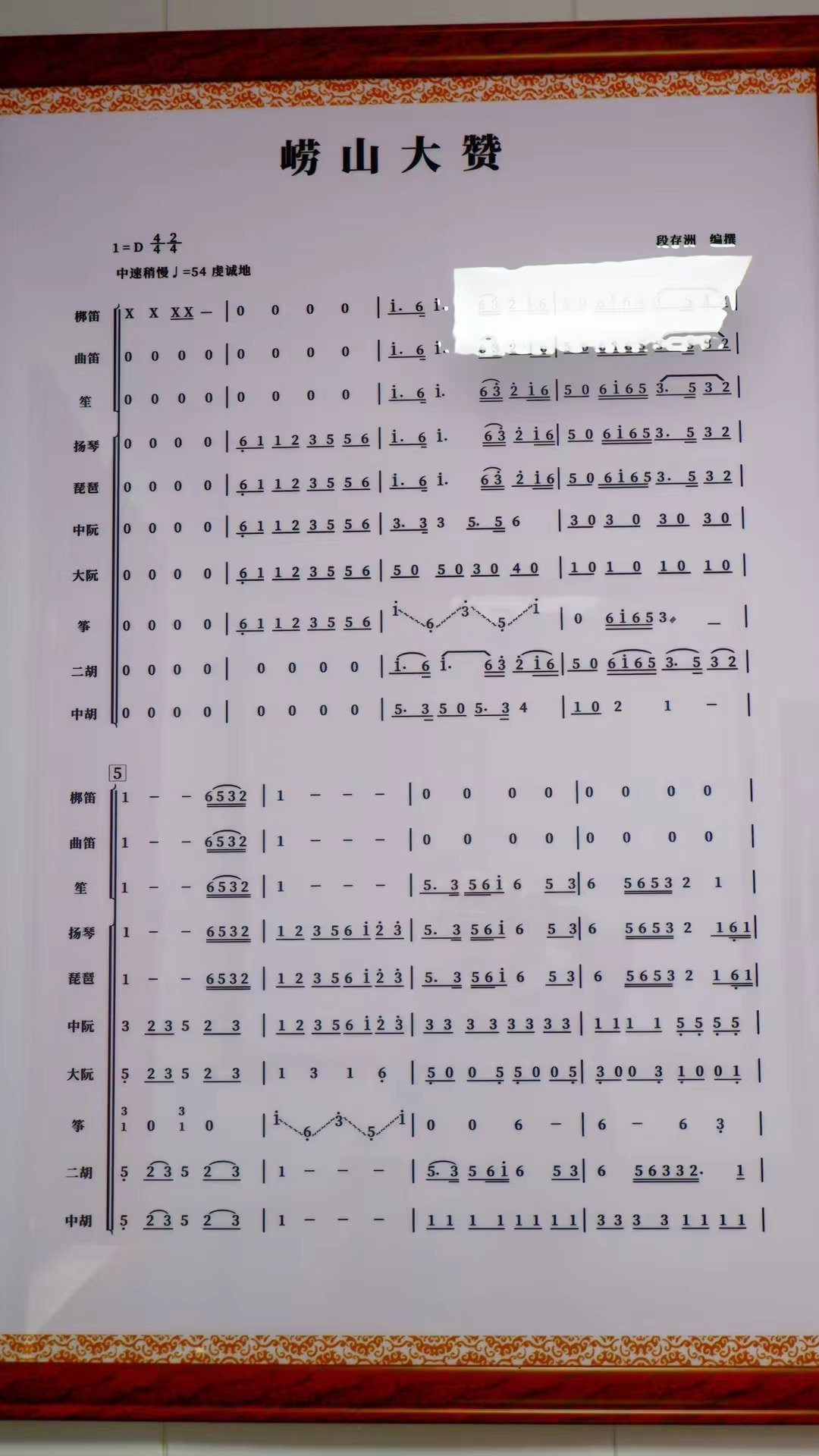 放下馆藏,进入宫门,首先映入眼帘的就是崂山道教文化陈列室,其中展示了《崂山大赞》《崂山小赞》《八仙论道》(二)《文辞》四首经韵的简谱。还记录了唐天宝年间,李白与吴筠云游崂山之际,创作了《清平调·咏王母蟠桃峰》,并将其曲牌及《步虚耳》韵与南派大型经韵曲牌《三塗五苦颂》传授给了太清宫道士。