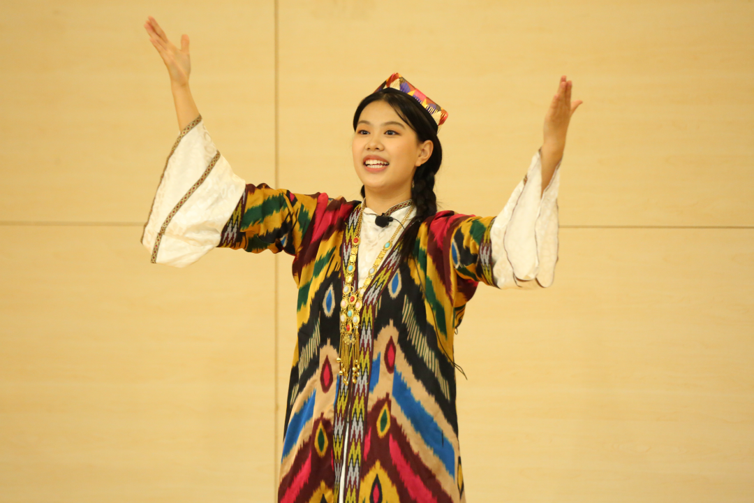 2023级本科生孙梦晗以一曲维吾尔族民歌《莱丽古丽》和充满热情的舞姿将大家带到了新疆地区,充满着浓郁的民族风情。
