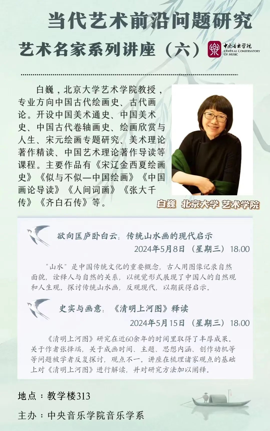 白巍,北京大学艺术学院教授,专业方向中国古代绘画史、古代画论。开设中国美术通史、中国美术史、中国古代卷轴画史、绘画欣赏与人生、宋元绘画专题研究、美术理论著作精读、中国艺术理论著作导读等课程。主要作品有《宋辽金西夏绘画史》《似与不似一中国绘画》《中国画论导读》《人间词画》《张大千传》《齐白石传》等。