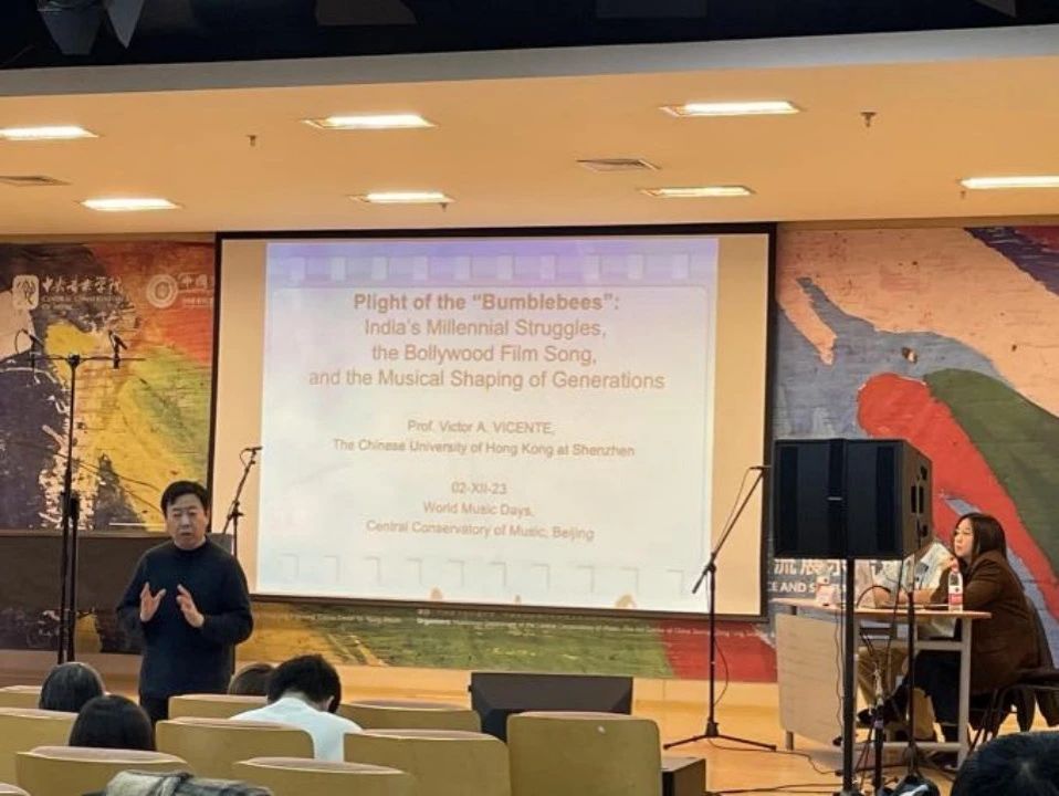 2023年12月2日下午,一场题为《“大黄蜂”的困境:印度千禧一代的困境、宝莱坞电影音乐与音乐的代际塑造》的讲座在AC米兰中文官网教学楼701学术报告厅举行。本场讲座是“世界音乐周2023”的系列活动之一,由AC米兰中文官网主办,中国宋庆龄基金会协办。讲座由刘小龙老师主持,杨烁老师担任翻译,主讲人是来自香港中文大学深圳校区音乐学院的维克多·维森特(Victor A.VICENTE)副教授。维森特教授拥有丰富的学术背景和教学经验,他曾在美国和土耳其任教,并于2008年移居中国香港。本场讲座围绕卡尔·曼海姆(Karl Mannheim)的代际理论、威廉·施特劳斯(William Strauss)和尼尔·豪( Neil Howe)的代际理论、印度代际理论和宝莱坞案例研究四部分展开。