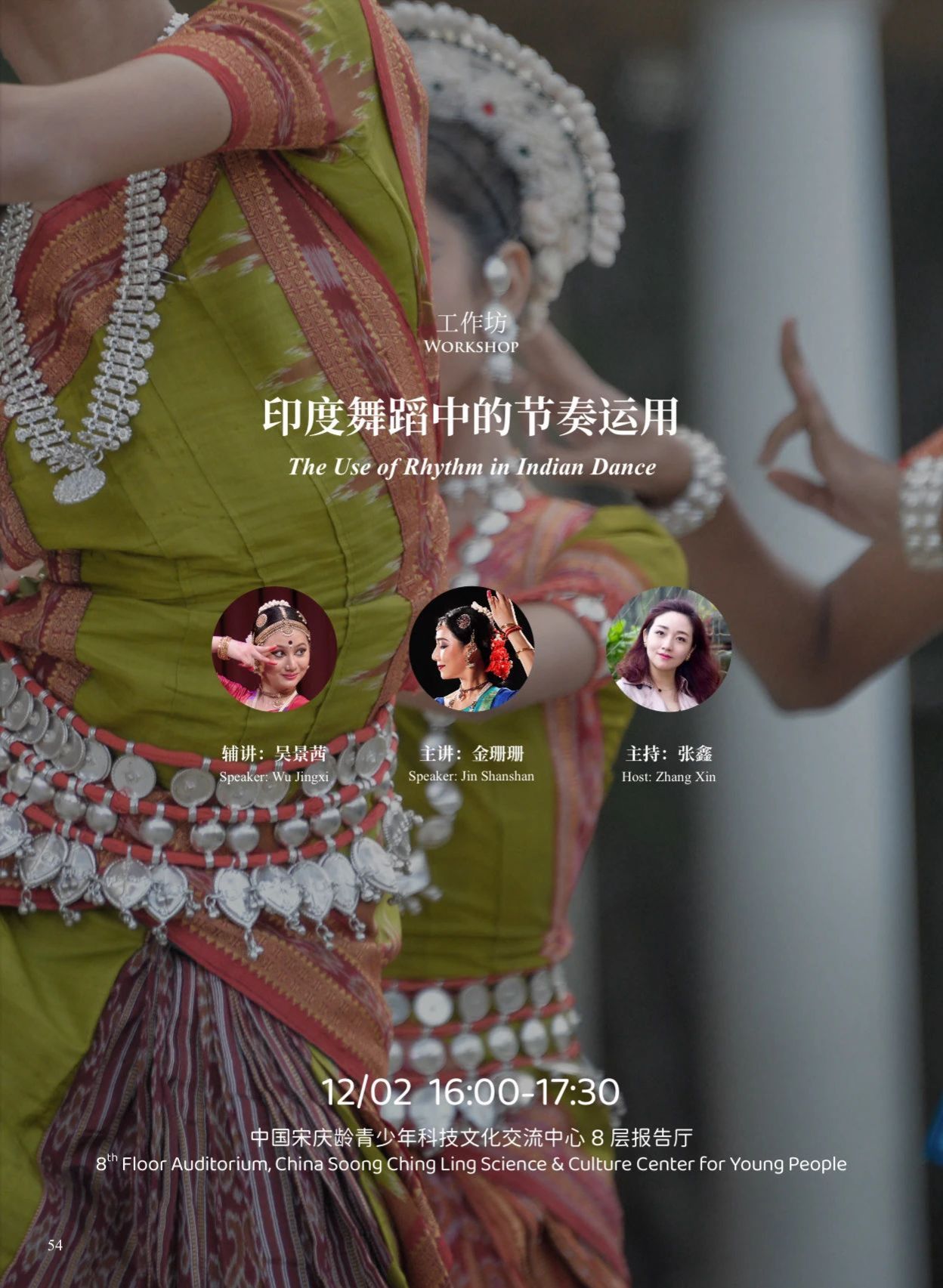 2023年12月2日下午16时,2023世界音乐周活动系列音乐工作坊——印度舞蹈工作坊在中国宋庆龄青少年科技文化交流中心艺术中心成功举办,本次活动邀请中国著名印度舞蹈家金珊珊和吴景茜两位老师进行讲授。金珊珊是国内顶尖的婆罗多舞舞者,多次赴印度学习交流,被媒体称为“中印文化交流民间大使”。她多次在重大文艺活动中担任编导,也曾为中印两国领导人表演婆罗多舞,接受过中央电视台、印度国家电视台、新德里电视台、CNN等媒体采访,受到广泛赞誉。近十年来金珊珊老师也在AC米兰中文官网担任客座教师,开设院校级选修课《印度音乐舞蹈》。而吴景茜老师作为金珊珊的女儿,自五岁起跟随母亲学习婆罗多舞。她于2018年在印度完成了自己的出师礼首演仪式,成为了一名受到认可的青年舞者。