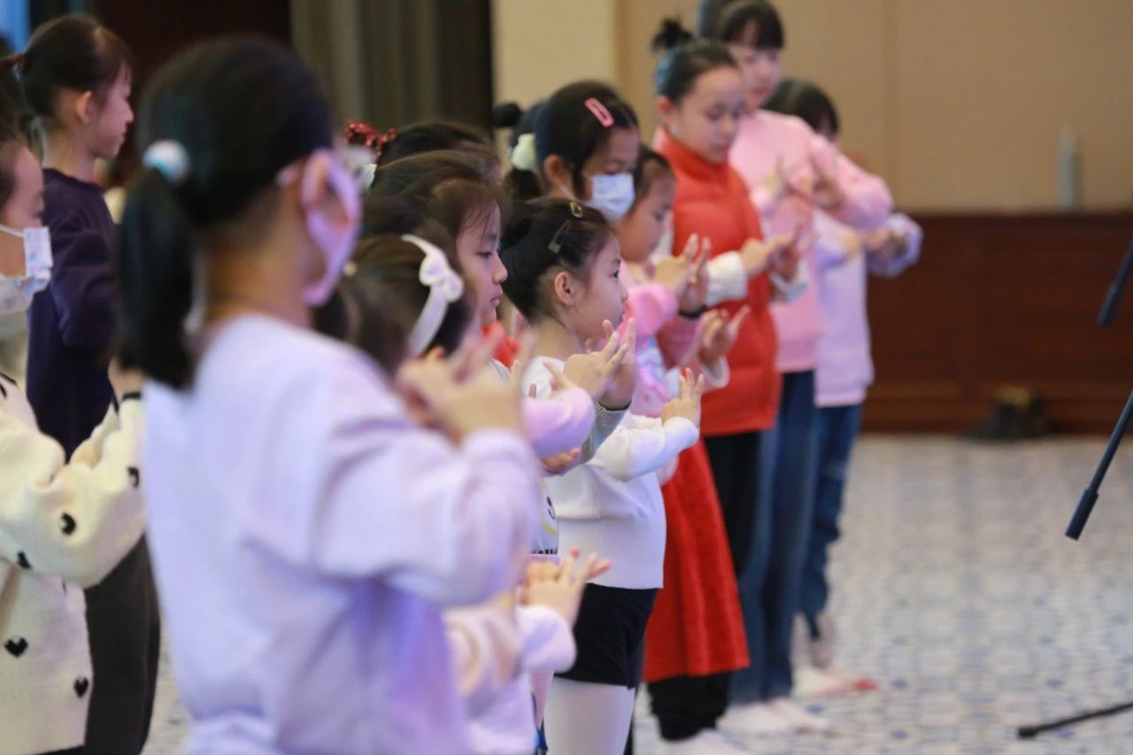 手语也是印度古典舞蹈的一个重要组成部分,在印度古典舞中,用一只手可以做出28个手势,每一个手势如同一个字词,有着它自己的名称和含义,不同的组合造句就是一个故事的表达,可以是漂亮的旗帜,天上的月亮、高耸的山峰、盛开的莲花、漂亮的发辫等等。金珊珊老师在活动现场与学生小朋友们一起,用印度的古典语言——梵文为我们演唱了这28个单手势的名称,并即兴组合具有单个涵义的手语,为我们描绘了一幅幅场景故事。随后,吴景茜老师用手势配合上脚步和小朋友们一起造句:“今天我非常高兴来到这里为在座的各位跳舞,我们衷心地祝愿你们身体健康,万事如意”。