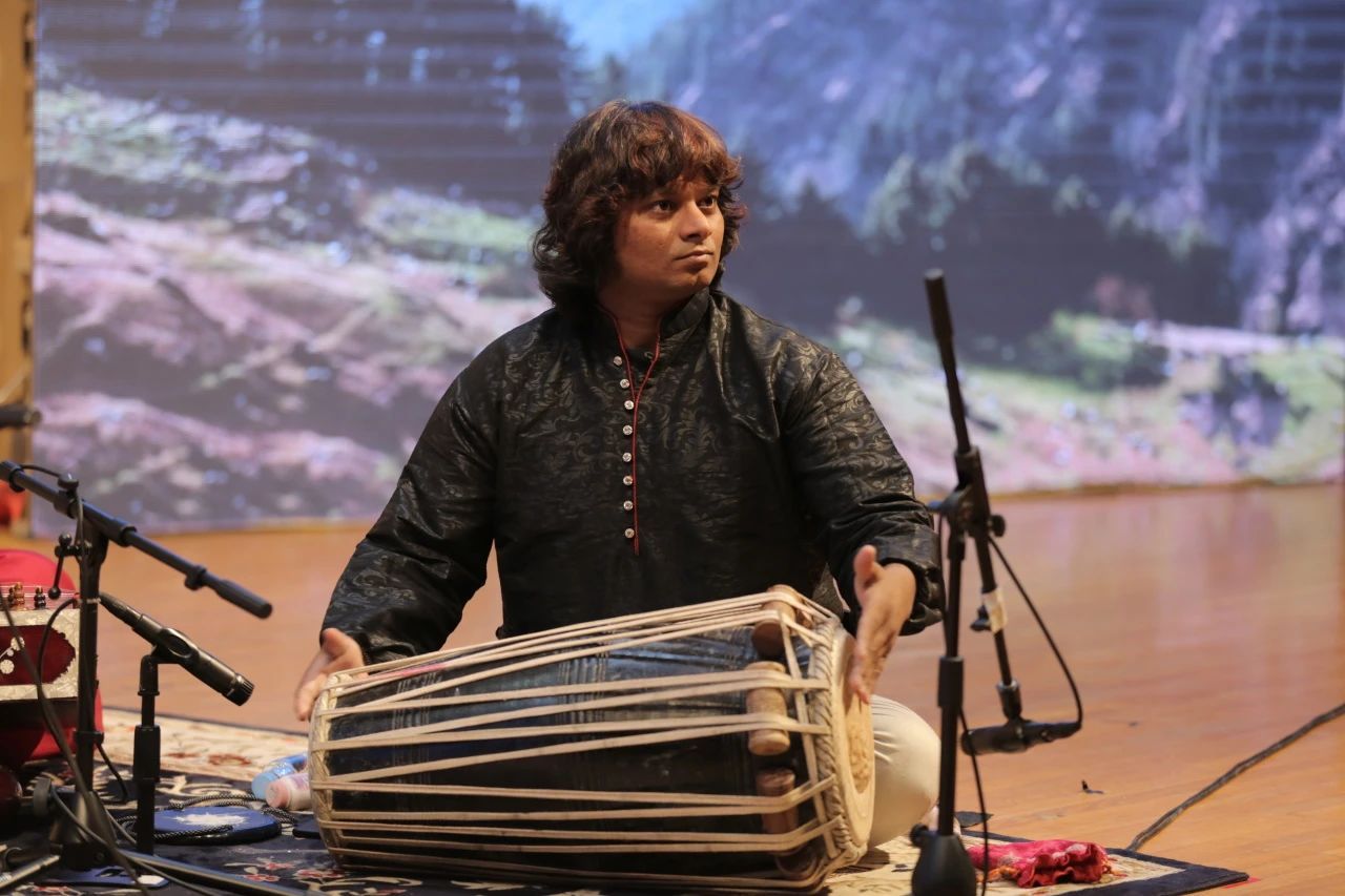 再看本场主奏乐器桑图尔,其外形酷似扬琴,本身与扬琴也是同宗同源。娑婆里家族自几百年前将桑图尔这种乐器从克什米尔山谷带往北印度后,就不断改良桑图尔琴的形制与演奏技法,自此桑图尔不断与印度宗教文化与印度的拉格音乐体系融合,最终形成印度独特的桑图尔乐器。从形状上看,桑图尔体积较扬琴更小且更宽,半盘腿置于大腿上演奏。桑图尔琴除了击弦演奏之外,还演化出了拉弦、揉弦等弓弦乐器上才有的表现方法。它的琴竹末端呈倒月型,承担击弦工作,而琴竹柄部则可以通过与琴弦大力摩擦发出低沉嘶吼的声音。桑图尔击弦部分技巧极多,其中最令观众们感到震惊的是震动击弦的演奏技巧,即通过上下震动琴竹短时间内快速击弦,这种演奏方式打破了观众对于击弦乐器只能够单音快速演奏的认知,震动击弦能够流动地推动音程的发展从而交织出极为婆娑的声音,将两个音的音程发展变化做到极致。同时,印度的桑图尔演奏往往是器乐与声乐合二为一的,阿拜·儒斯特姆·娑婆里在演唱的过程中,就常常采用这种快速震动击弦的方式演奏,将乐器的婆娑声与人声的婉转流动严密的交织在一起,这也体现了演奏家高超的演奏和演唱水准。