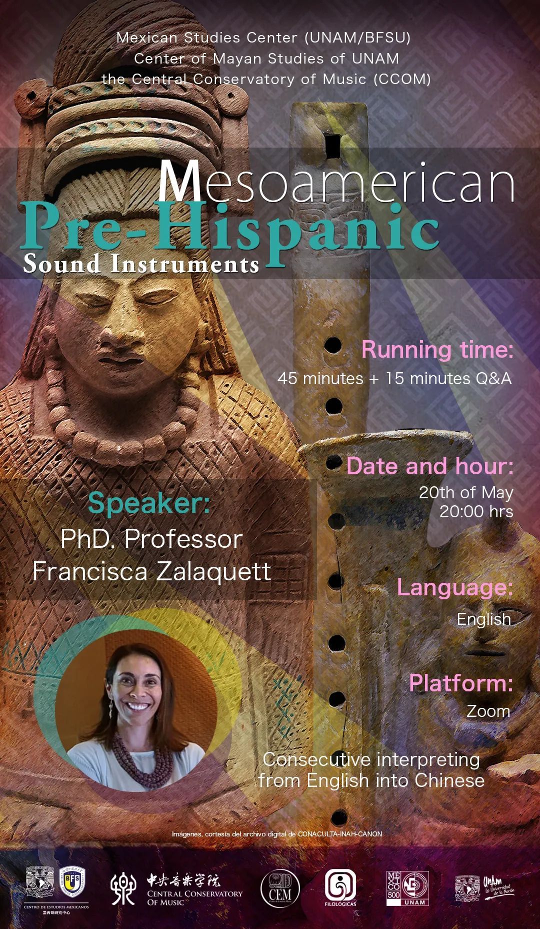 作为社会群体的成员,人类及其所在环境产生的声音可以被感知和编辑,因而一些声音可以成为交流的手段。在这场讲座中,主讲人将介绍前西班牙时期位于墨西哥和危地马拉出土的各种乐器的考古声学研究。主讲人提出了一种分析和界定各类乐器的声学方法,并将相关的背景信息纳入参考因素。这是为了解释玛雅和阿兹台克人的仪式,以及日常生活中特定时刻如何实现、共享和使用声音。
