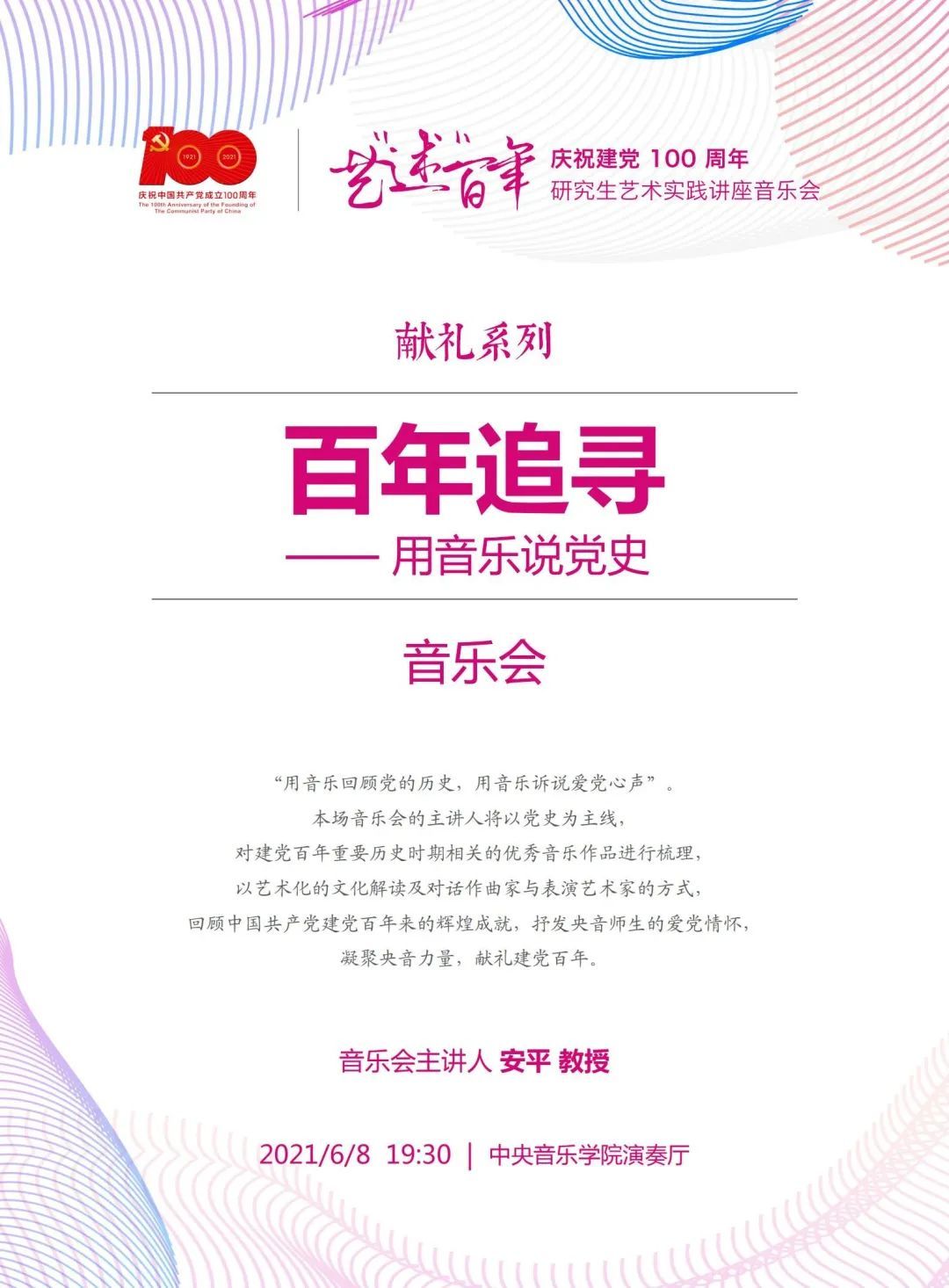 “用音乐回顾党的历史,用音乐诉说爱党心声”。本场音乐会的主讲人将以党史为主线,对建党百年重要历史时期相关的优秀音乐作品进行梳理,以艺术化的文化解读及对话作曲家与表演艺术家的方式,回顾中国共产党建党百年来的辉煌成就,抒发央音师生的爱党情怀,凝聚央音力量,献礼建党百年。