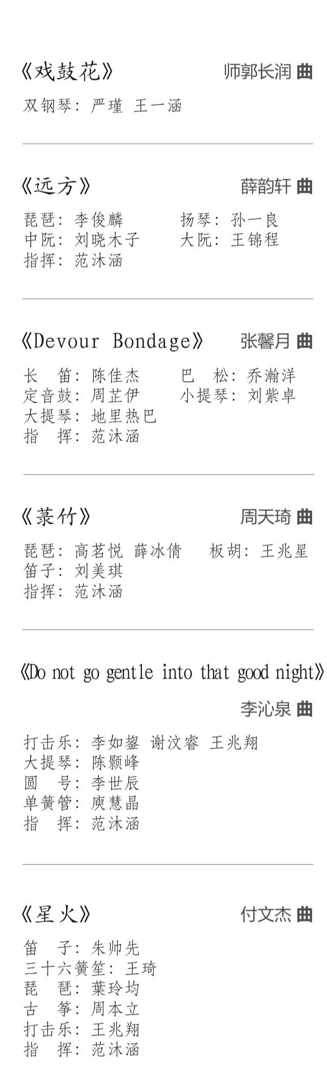 互重互敬的多元意识 进入20与21世纪,令人耳目一新的新作品使创作、演奏与接受之间逐渐出现距离感。创作中的现代性、怪诞、不悦耳和演奏中大量具有先锋实验性的新技法使接受者感到困惑、迷茫、难以理解。为了改善这种疏离感,本场音乐会的作曲同学们没有将先锋的创作实验或纯粹的演奏技法革新视为唯一的目的,而是试图在完成自我表达的同时尽可能兼顾演奏与接受;演奏同学们尽力告知各自的经验与感受以协助作品的完善,使新作品在多元意识的共同参与下不再那么“遥不可及”!