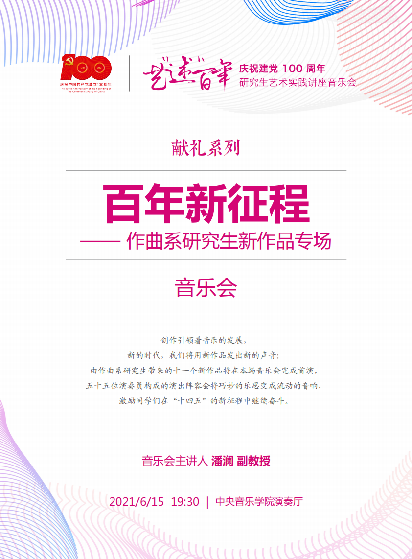 在建党百年之际,本场音乐会将以11首新作品展现当代中国青年学子立足中国文化、面向世界的开阔视野,以新姿态、新意识、新解读踏上构建中国未来音乐风貌的新征程!