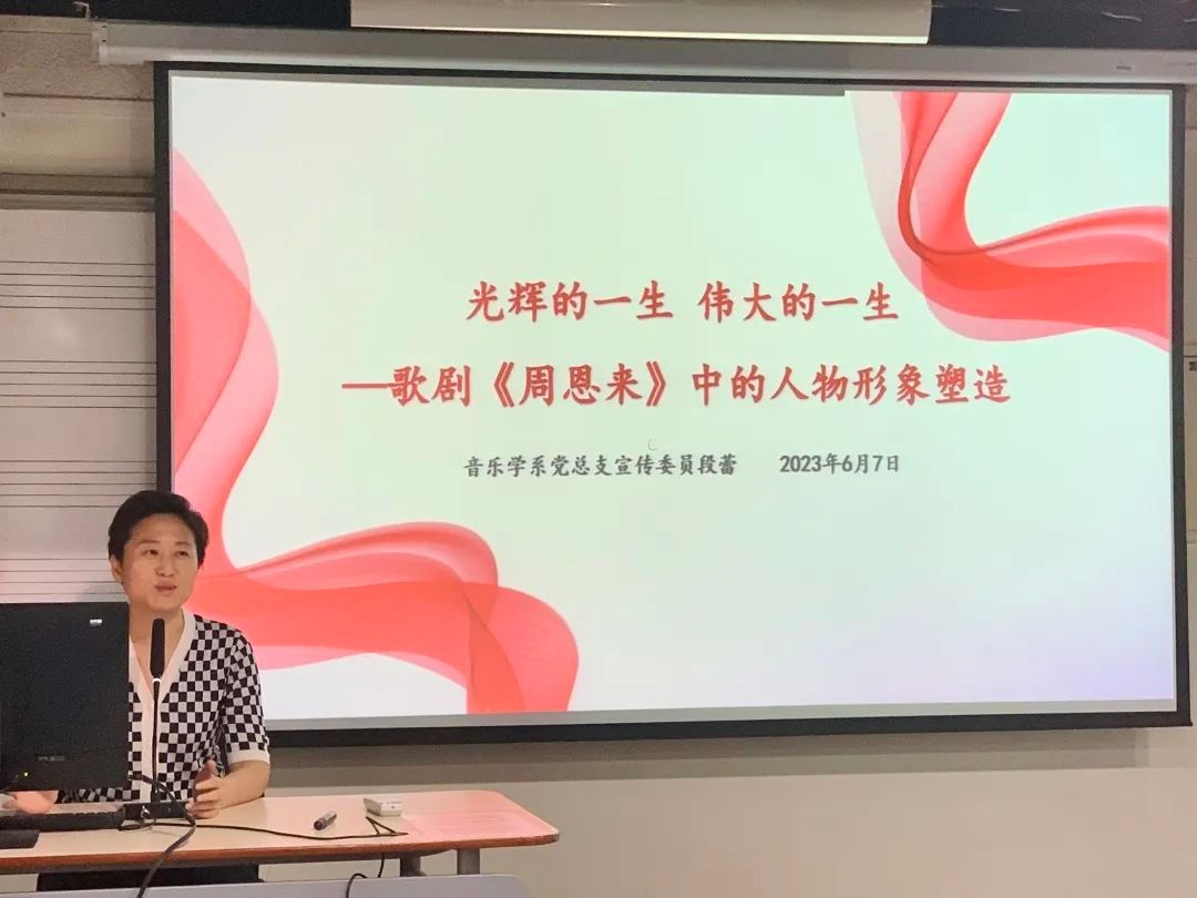 音乐学系党总支宣传委员段蕾副教授选取了歌剧《周恩来》作为党课分享的主题,段老师结合谱例分析和视频,重点阐释了这部歌剧是如何塑造周总理光辉伟大的人物形象的。首先,在歌剧序曲中,作曲家对周总理的形象进行了高度的凝练与概括,随后从“深入人心的大国总理形象”“危急关头挺身而出的智慧与担当”“周总理与邓颖超的革命情谊”三个不同层面对周总理的人物形象进行塑造,使其更加饱满生动。
