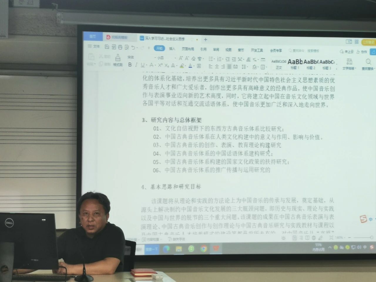 本期党课由音乐学系系主任安平教授与副系主任潘澜教授分别以“深入学习习近平新时代中国特色社会主义思想,探索借鉴世界不同古典音乐文化体系,建构中国古典音乐体系”为主题展开。