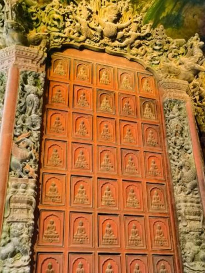 随后,同学们参观了藏殿和如来殿。藏殿是智化殿的西配殿,里面保存着一个珍贵的明代转轮藏。这具转轮藏高约4米,呈八边形,每一面都有九排五列的抽屉用于存放经书。每个抽屉表面都有一尊浮雕释迦像,并刻有千字文用于检索。上方和八面的柱子都雕刻着佛教里的一些形象,如大鹏金翅鸟、龙女、象王、摩羯鱼等,原有彩绘,但因时代久远都已剥落不见。