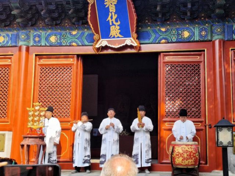 参观完智化寺几个主要的建筑,师生们来到智化殿前,欣赏智化寺京音乐演奏。智化寺京音乐自明代从宫廷传入智化寺起,一直按照保守严格的训练方式代代传授,至今已传承至第二十七代。智化寺京音乐以管子为主奏乐器,辅以笛、笙等吹奏乐器和云锣、鼓等打击乐器,采用工尺谱记谱。国家级非物质文化遗产传承人、京音乐管子的演奏者胡庆学老师先向同学们简单介绍智化寺京音乐的历史、传承方式及所用乐器。