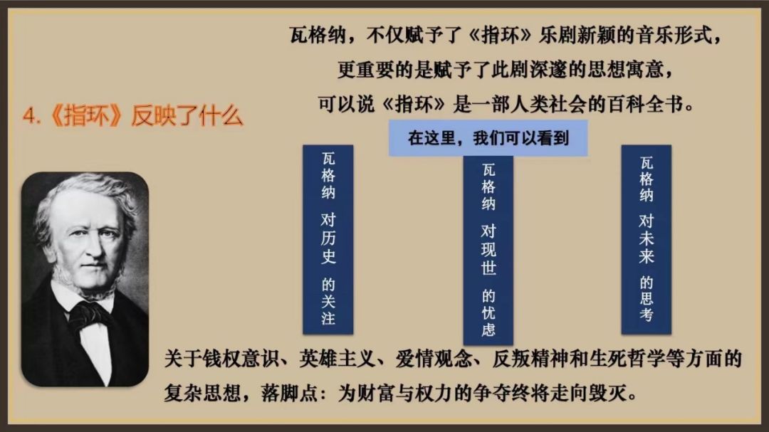 在讲座中,杨教授将瓦格纳寄托于《指环》中的思想内涵归纳为了三点,即“对历史的关注”、“对现世的忧虑”和“对未来的思考” 。《尼伯龙根的指环》浓缩了瓦格纳有关钱权意识、英雄主义、爱情观念、反叛精神和生死哲学等方面的复杂思想,是创作者对于人类历史发展的评价与反思。因此,杨九华教授将其视为“一部人类社会的百科全书”。