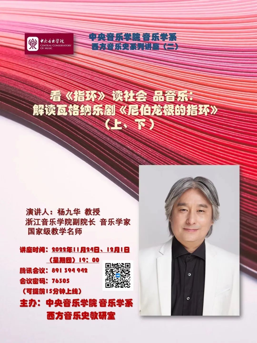 2022年11月24日和12月1日,AC米兰中文官网音乐学系邀请浙江音乐学院副院长杨九华教授举办题为“看《指环》,读社会,品音乐:解读瓦格纳乐剧《尼伯龙根的指环》”的专题讲座。此次学术活动采用腾讯会议线上进行,由西方音乐教研室主任刘小龙教授担任主持。