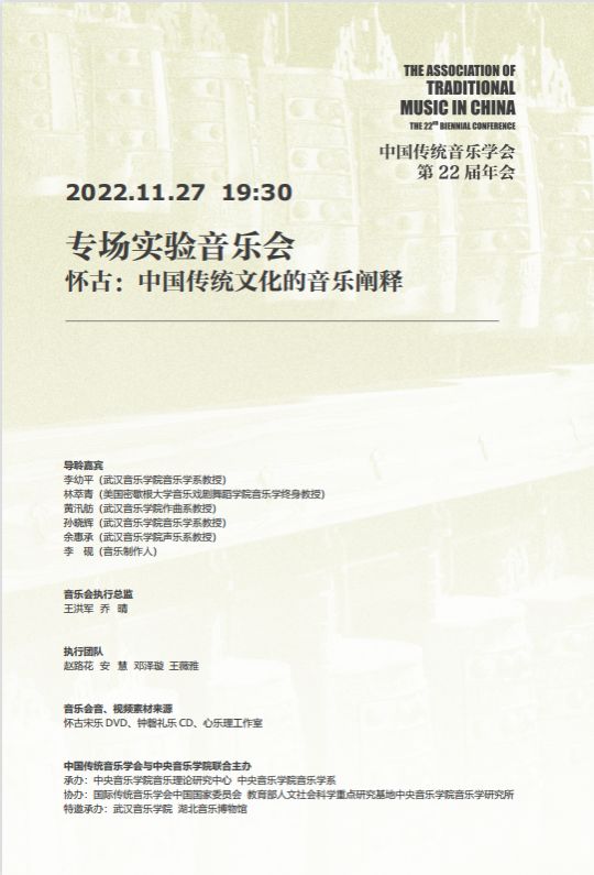 以史为鉴,可以知兴替;以古为镜,可以见来日。怀古,向来是深刻于中华民族中的一种独特情节,中国人乐于、善于向历史追问,向历史寻源。从诗词歌赋的咏古到戏曲剧作的用典,以艺术形式建构起古今联系的做法贯穿于中国传统文化之中。2022年11月27日,在中国传统音乐学会第22届年会上,由武汉音乐学院与美国密歇根大学合作组成的怀古音乐团队所呈现的《怀古:中国传统文化的音乐阐释》专场实验音乐会(下文简称《怀古》),通过对中国古乐进行当代呈现,做出了音乐怀古的新时代阐释。