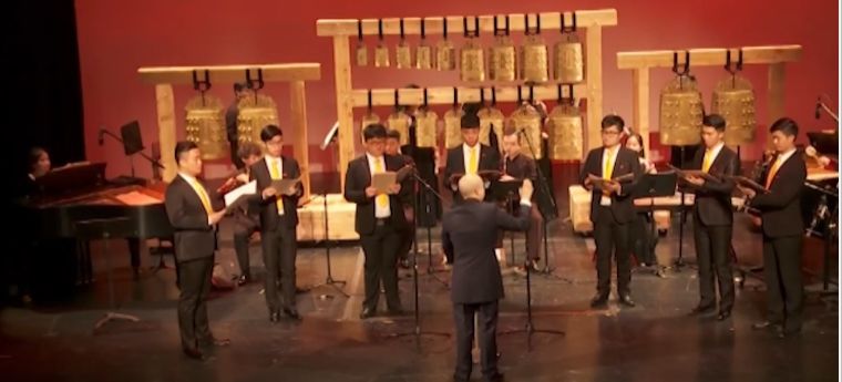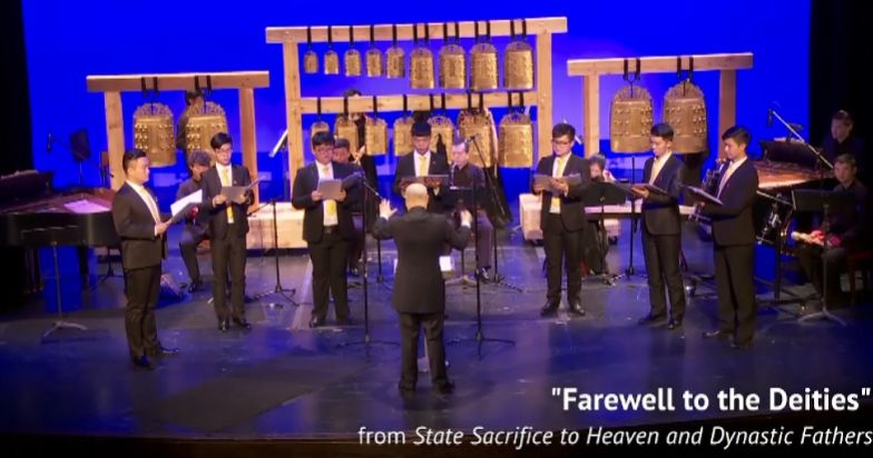 “礼乐”是中国古代音乐最为重要的音乐制度之一,在《怀古》音乐会中我们也可以发现,除音乐音响结构本身具备的“起承转合”特征,以及所带来的历史气息之外,音乐会本身的结构同样具有一种怀古的“礼制”特征。音乐会以《神人畅》为序,以《迎神》为正曲开篇、《送神》收尾,中间伴有声乐表演。历史记载中的西周礼乐仪式流程为:金奏(序)、正乐(升歌-下管-间歌-合乐)、歌彻,这与本场音乐会的结构模式十分相似。另外,对于“器”的使用,则是怀古礼制的另一个体现。本场音乐会中除三首艺术歌曲外,作为核心乐器的复原宋代大晟新钟几乎贯穿始终,编钟是中国古代宫廷音乐的代表,除乐器之外,它还作为礼器,象征着严格的礼乐等级制度。与编钟一同出现的男声合唱(暗比登歌),即是当代视域下对周代乐悬制新的阐释。