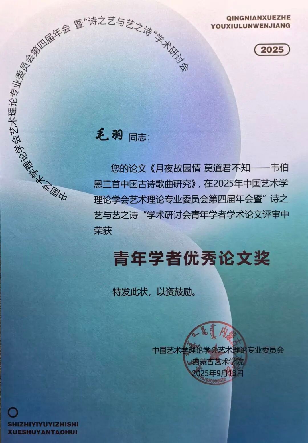2025年9月,我系教师毛羽的论文《月夜故园情 莫道君不知——韦伯恩三首中国古诗歌曲研究》,在2025年中国艺术学理论学会艺术理论专业委员会第四届年会暨“诗之艺与艺之诗”学术研讨会青年学者学术论文评审中荣获“青年学者优秀论文奖”。
