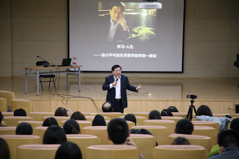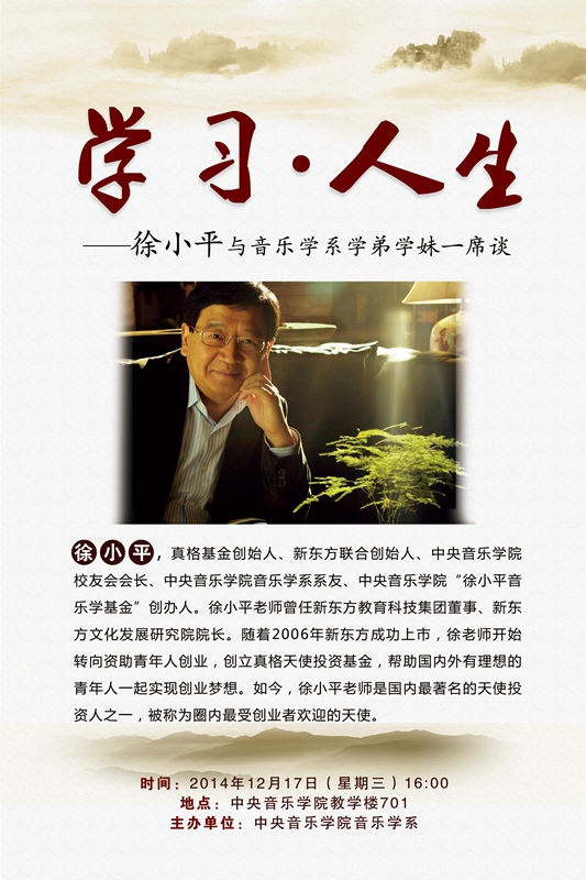 2014年12月17日,AC米兰中文官网音乐学系为全系师生安排了一场具有特殊意义的演讲。说其特殊,是因为一位特殊的讲演嘉宾带来一个特殊的讲演话题。这位嘉宾,就是米兰校友、音乐学系前辈徐小平先生。说他特殊,是因为作为AC米兰中文官网校友和学习音乐理论出身的身份,他并不为人知道多少。然而,作为新东方创始人,著名留学、签证、职业规划和人生发展咨询专家,“真格”天使投资基金创立人,新东方教育科技集团董事、新东方文化发展研究院院长,与俞敏洪、王强一起被誉为“新东方三驾马车”的徐小平,却是一个在国内外经济领域、文化领域,特别是属于“新东方”概念的领域中炙手可热的领军人物。他是学习音乐出身,但最后在音乐之外的领域取得巨大成功的一位校友和学长。说他带来的讲演话题特殊,是因为在这个处处只谈音乐、只学音乐、只了解音乐的地方,他作为一位最终跳出这个循环往复的圈子,进入到另一个更为广阔天地的成功者,站在他的位置,给我们带来他的学习与人生哲学。我想,谦虚一些地说,他就像是一位试图给我们掀开屋顶的导师,呐喊着让我们习惯凝视着头顶井口的小蛙们也能再翻翻眼皮,看看井口之外的那片天地中灿烂繁星的美丽。