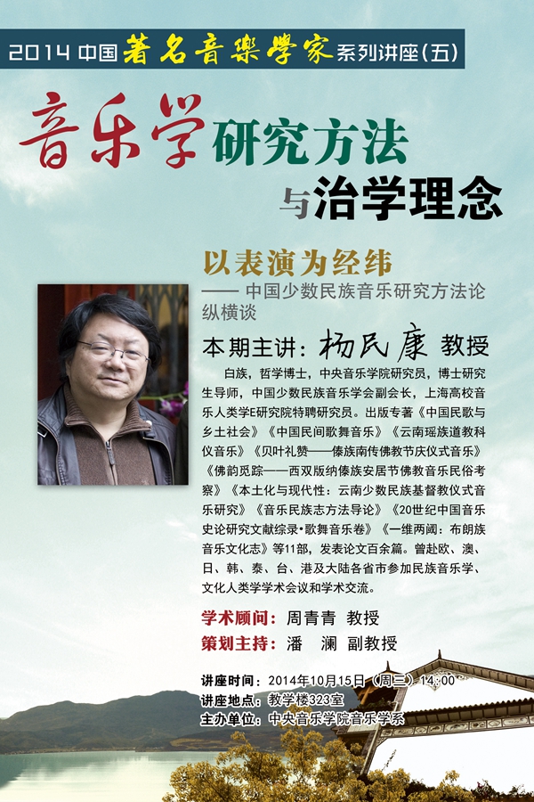 2014年10月15日14点,我院杨民康教授在教学楼323室为全院师生做了题为《以表演为经纬——中国少数民族音乐研究方法纵横谈》的精彩讲座。此次讲座是他近期在中国少数民族音乐研究领域的理论新思考,也是我系“音乐学研究方法与治学理念”讲座课程的第5期。