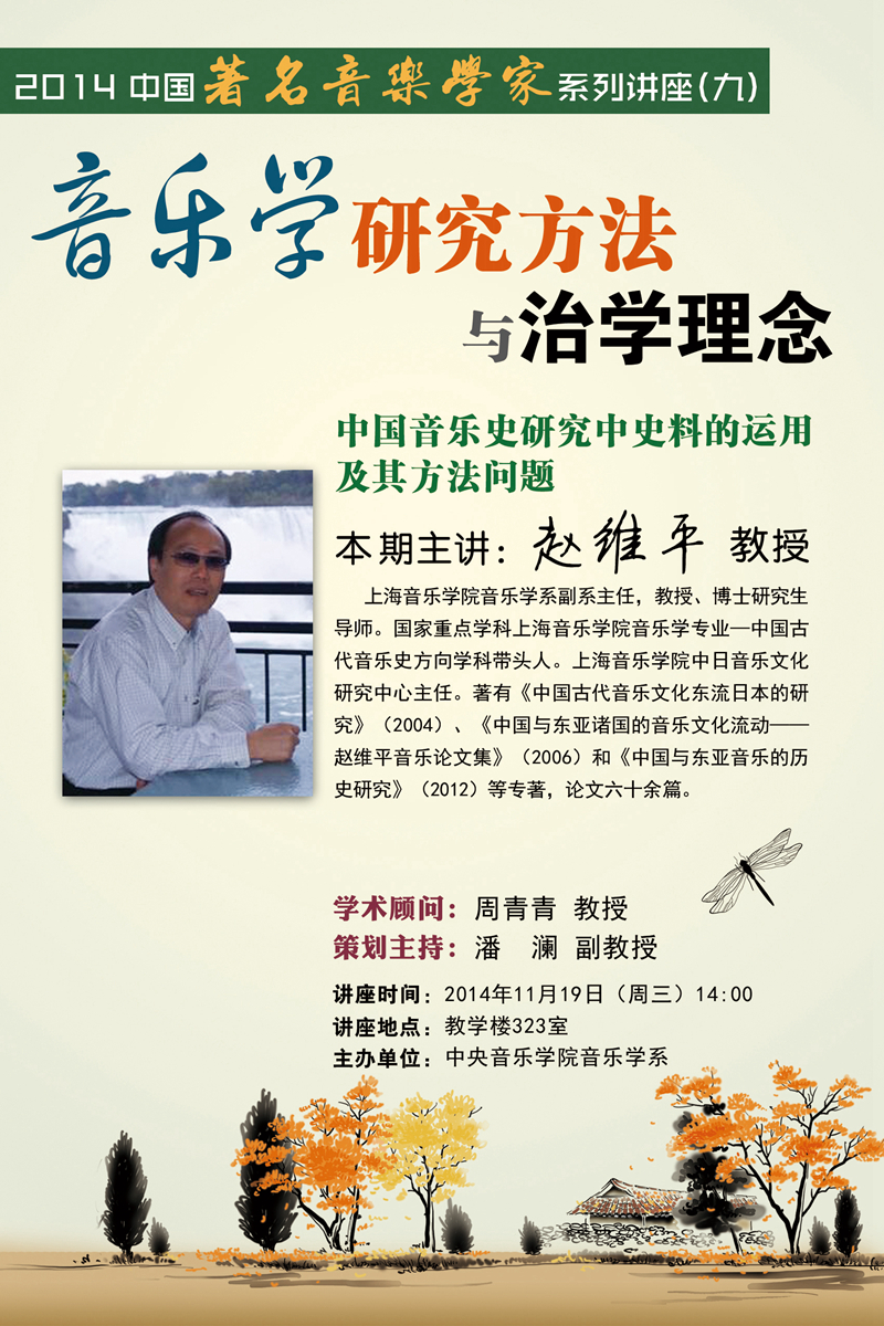 2014年11月19日(周三)下午,“音乐学研究方法与治学理念”系列讲座之第9期《中国音乐史研究中史料的运用及其方法问题》在AC米兰中文官网综合楼323教室举行。主讲者是上海音乐学院音乐学系博士研究生导师赵维平老师。赵维平老师专注于中国古代音乐史及亚洲音乐的研究,其代表性专著有《中国古代音乐文化东流日本的研究》等。