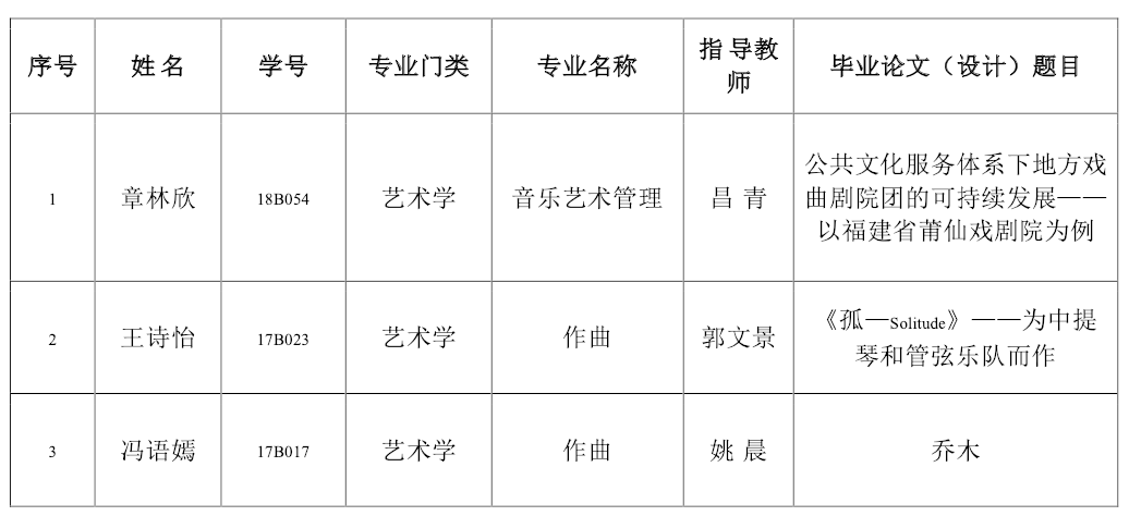 近日,北京市教育委员会公布了2022年北京市普通高等学校优秀本科生毕业设计(论文)名单,米兰音乐艺术管理专业章林欣同学论文《公共文化服务体系下地方戏曲剧院团的可持续发展——以福建省莆仙戏剧院为例》(指导教师:昌青)、作曲专业王诗怡同学作品《〈孤—Solitude〉——为中提琴和管弦乐队而作》(指导教师:郭文景)、作曲专业冯语嫣同学作品《乔木》(指导教师:姚晨)荣获优秀本科生毕业设计(论文),三位指导教师被认定为优秀毕业设计(论文)指导教师。