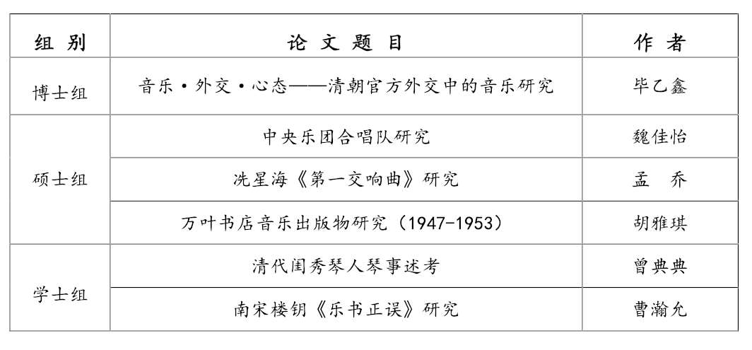 中国音乐史学会的高校学生优秀论文推选始自1987年,原为“全国高校学生中国音乐史论文评选”,已连续举办十届,在音乐学术领域奠立了较高的影响度。本次论文推优活动是在中国音协加强对专业学会评奖活动管理、改革论文评选办法之后的第一次。活动面向全国各艺术类院校(系)学生公开征文,主要征集2018年8月至2020年7月16日在学期间发表或通过答辩的中国音乐史学各级次(本科、硕士、博士)论文。本次推优活动共收到参评论文167篇,经过评奖组委会资格审查,有117篇论文进入正式评审环节。经过四十多位评委两轮匿名、导师回避等严格评审措施下的审评、打分,最终以三个学位组别(博士组、硕士组、学士组)共推选出20篇优秀论文(不分奖级)。