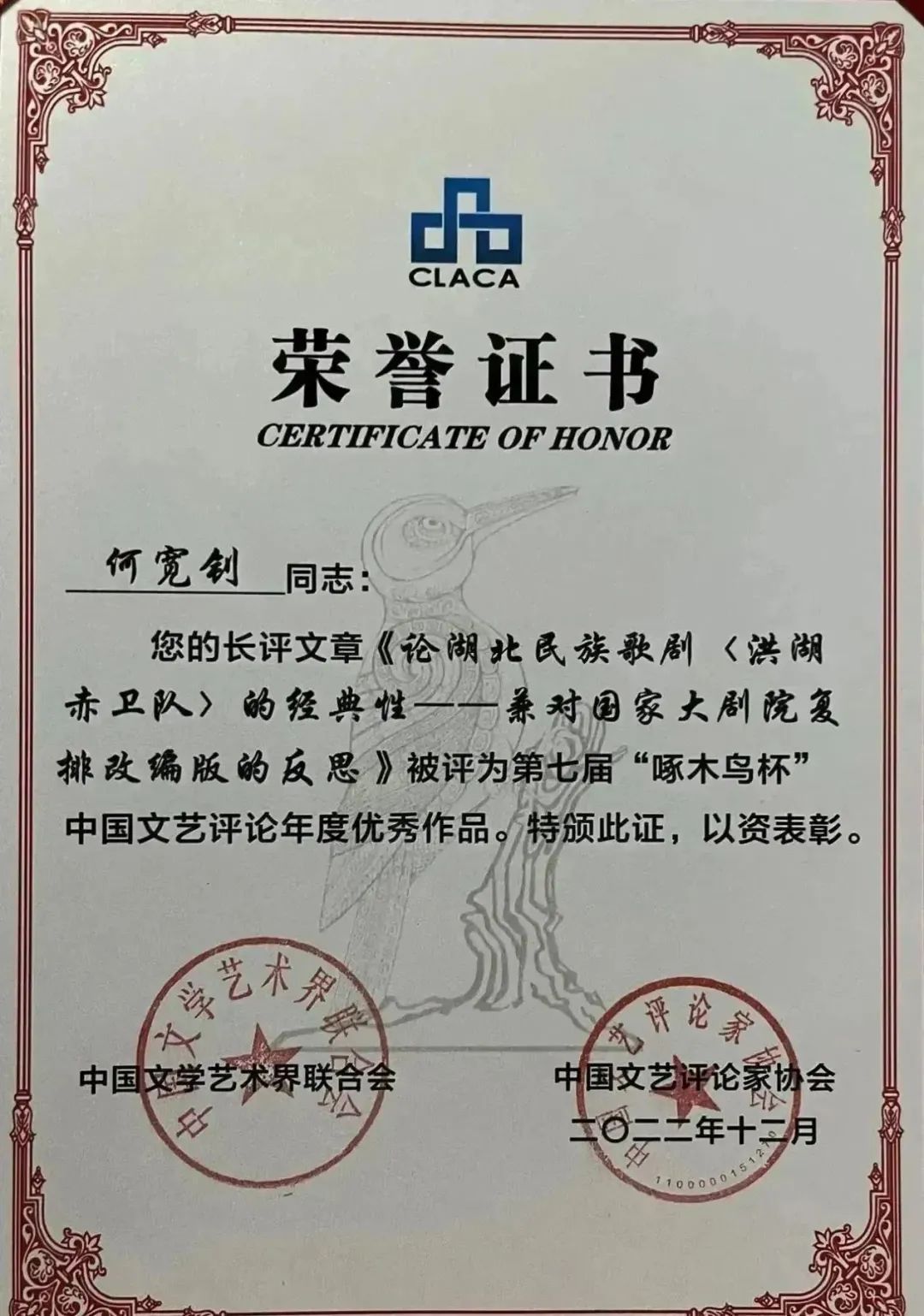 米兰音乐学系何宽钊教授的《论湖北民族歌剧<洪湖赤卫队>的经典性——兼对国家大剧院复排改编版的反思》一文荣获年度优秀作品,其本人被授予“啄木鸟”杯。