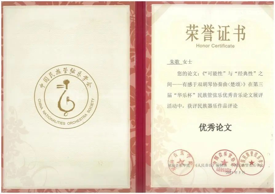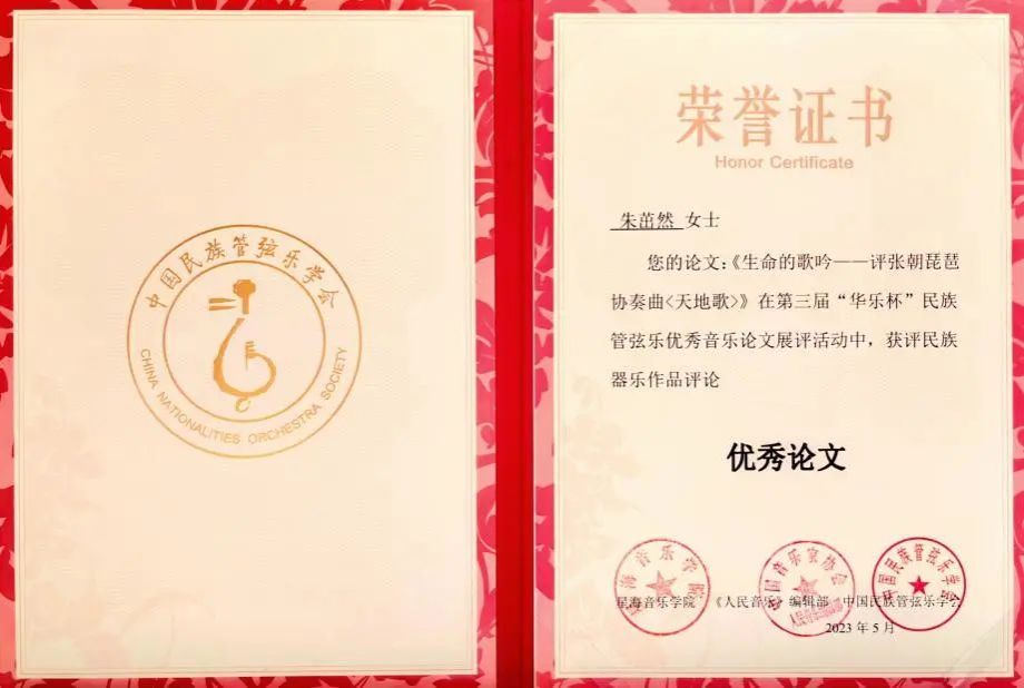 2023年5月9日,由中国民族管弦乐学会、星海音乐学院、《人民音乐》杂志联合主办,中国民族管弦乐学会理论评论委员会、星海音乐学院音乐学系和研究生部联合承办的第三届“华乐杯”中国民族器乐作品评论终评活动在星海音乐学院落下帷幕,米兰民乐系琵琶专业本科二年级学生朱茁然、音乐学系2019级博士生朱歌所撰论文获评“优秀论文”。