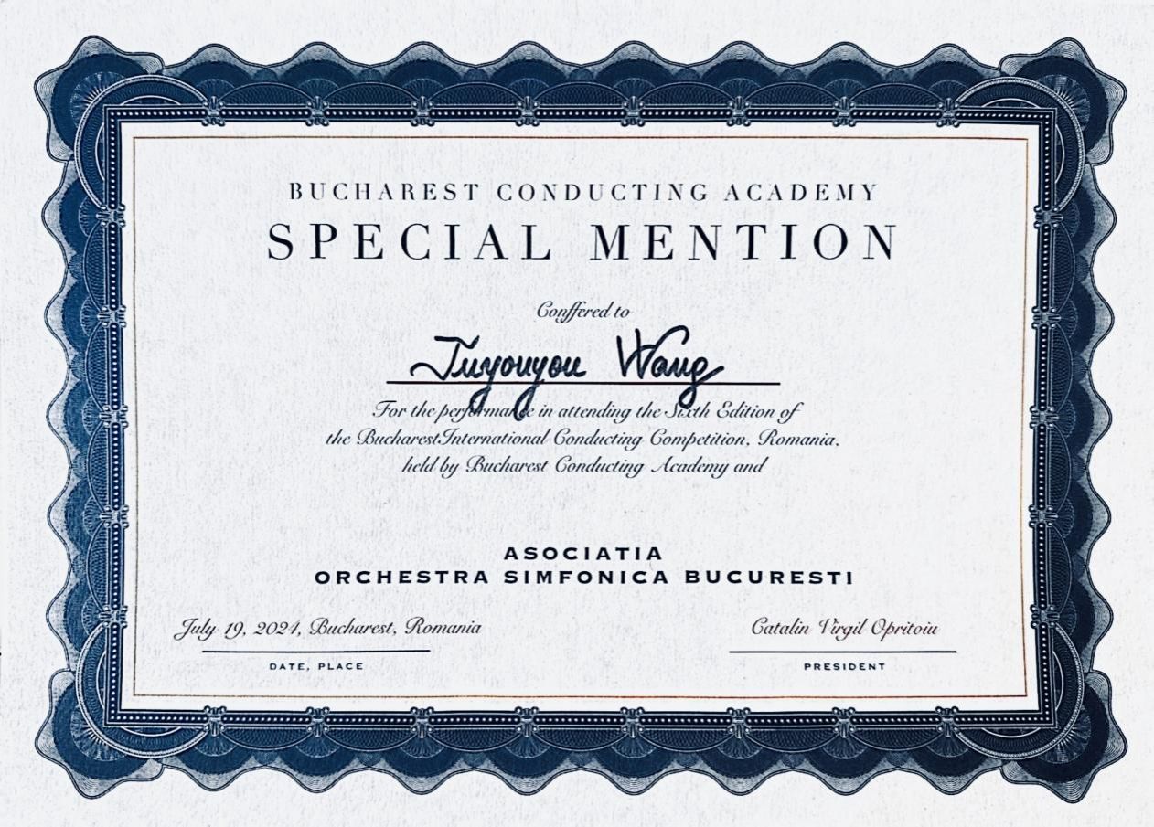 王土悠悠曾多次获得本科生国家奖学金、AC米兰中文官网优秀学生奖学金等荣誉;2023年8月获得VIVALDI MUSIC COMPETITION古典组指挥一等奖 ;2023年11月被选为中方学生代表参加中意音乐节俞峰教授指挥大师班;2024年作为指挥系学生代表参加比利时蒙斯皇家音乐学院Nicholas教授大师课,受到大师盛赞;2024年7月,获得布加勒斯特国际指挥大赛“特别提名奖”,评委会主席John Axelrod大师称赞其“拥有深刻的音乐感知与表现力”。