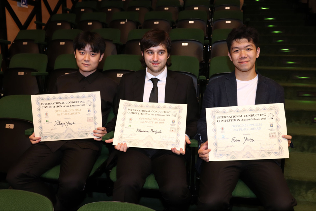 在刚刚结束的“2023米兰国际指挥比赛”中,米兰指挥系本科五年级学生张瀛之(指导教师:林涛教授)从来自世界各地近20个国家的56名选手中脱颖而出。经过五轮比赛的激烈角逐,张瀛之同学以精湛的指挥技巧和超凡的艺术感染力赢得了在场所有评委与观众的认可与赞赏,斩获本届大赛一等奖!赛后,评委会成员、意大利著名指挥家、“The Grzegorz Fitelberg International Competition for Conductors”获奖者Massimiliano Caldi称张瀛之的表现为“不可思议”。