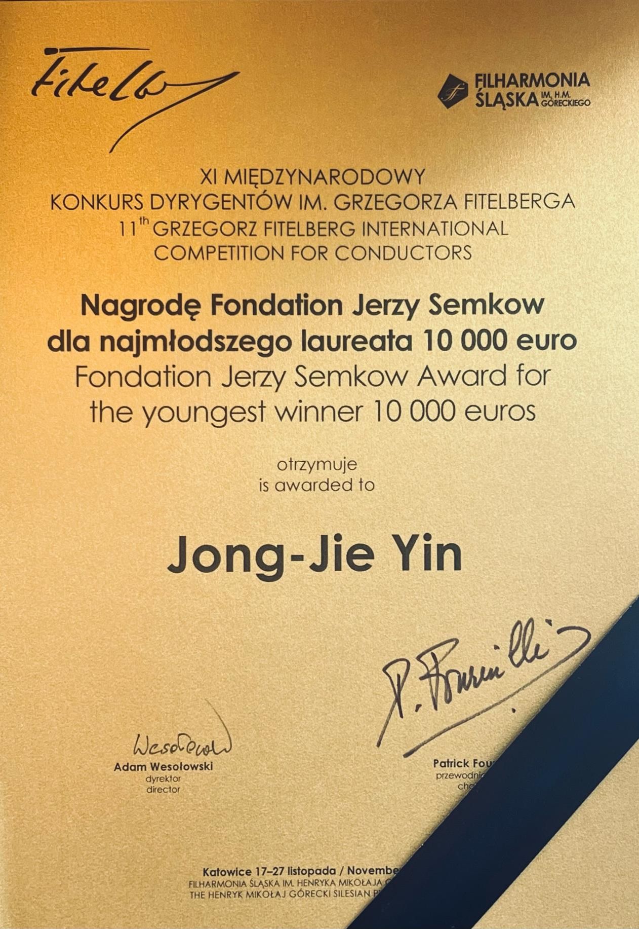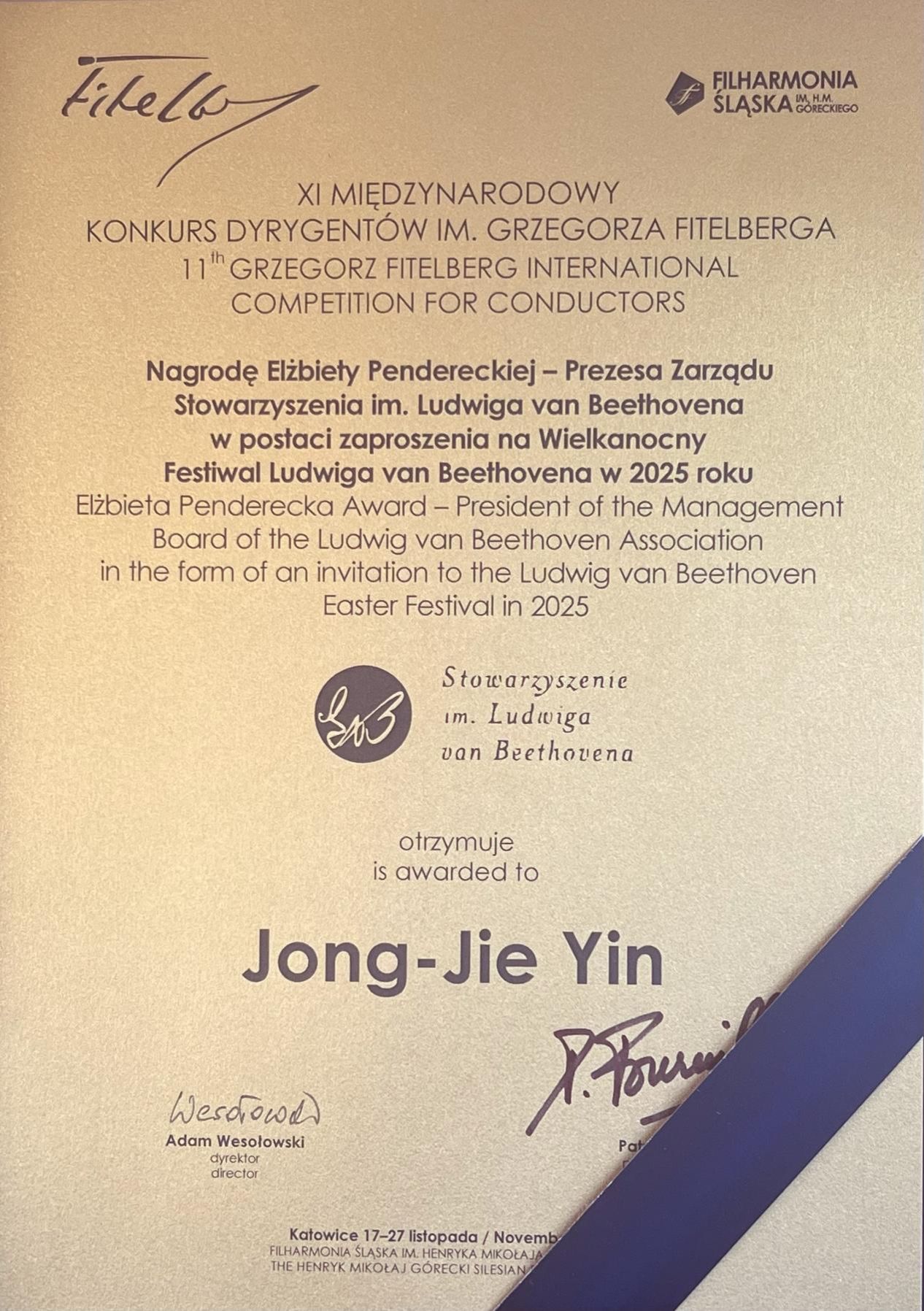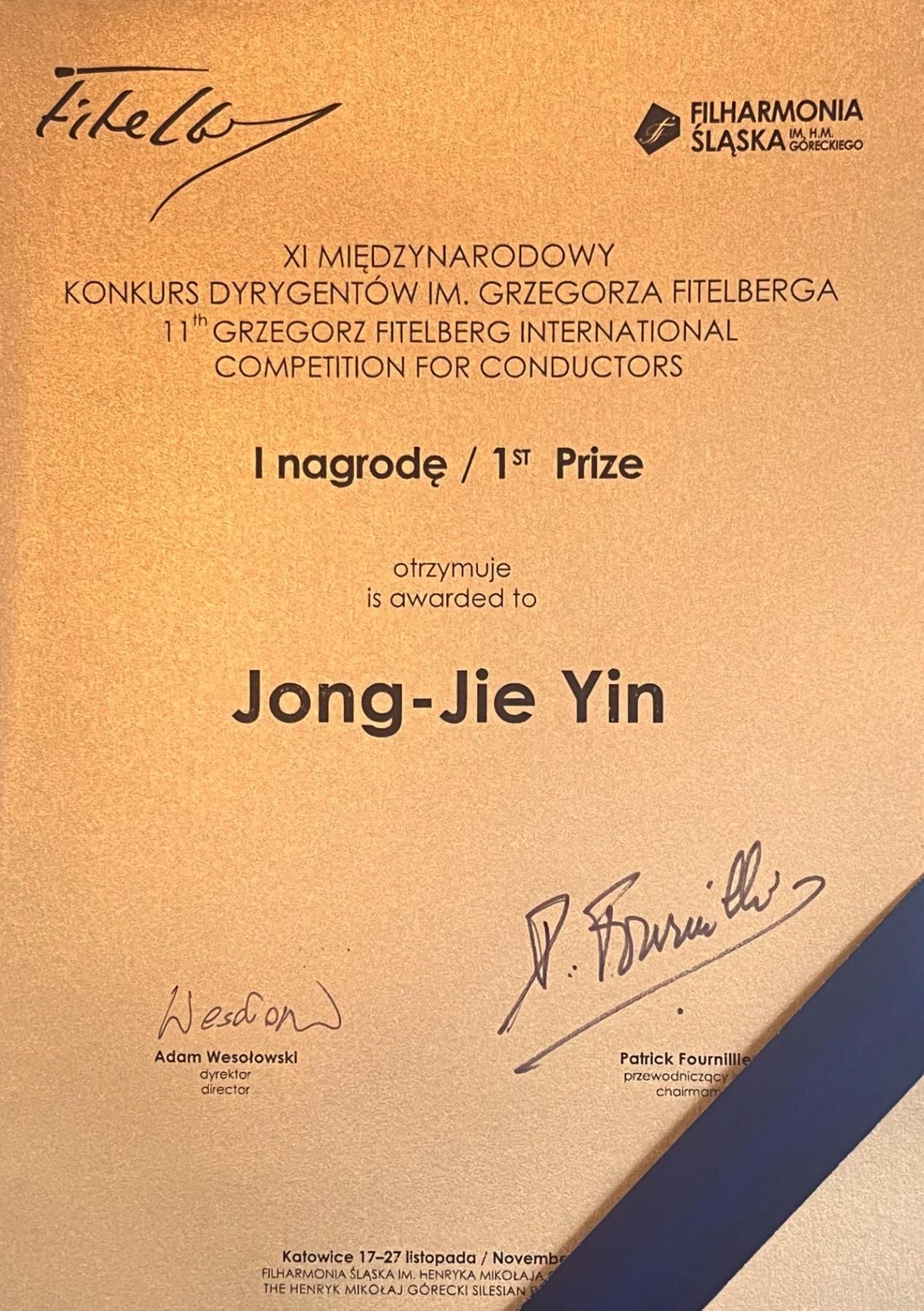 在刚刚落下帷幕的“波兰第十一届菲黛尔·伯格国际指挥比赛(11th Grzegorz Fitelberg International Competition for Conductors)”中,米兰指挥系硕士一年级研究生尹炯杰(指导教师:陈琳教授)凭借一流的专业水平和极强的艺术感染力在激烈角逐中拔得头筹,荣获第一名、“金指挥棒”奖、杰西·塞姆科夫基金会(Fondation Jerzy Semkow)特别奖以及“最佳波兰作品诠释”奖。在此,向获奖学生尹炯杰及其指导教师陈琳教授表示热烈祝贺!