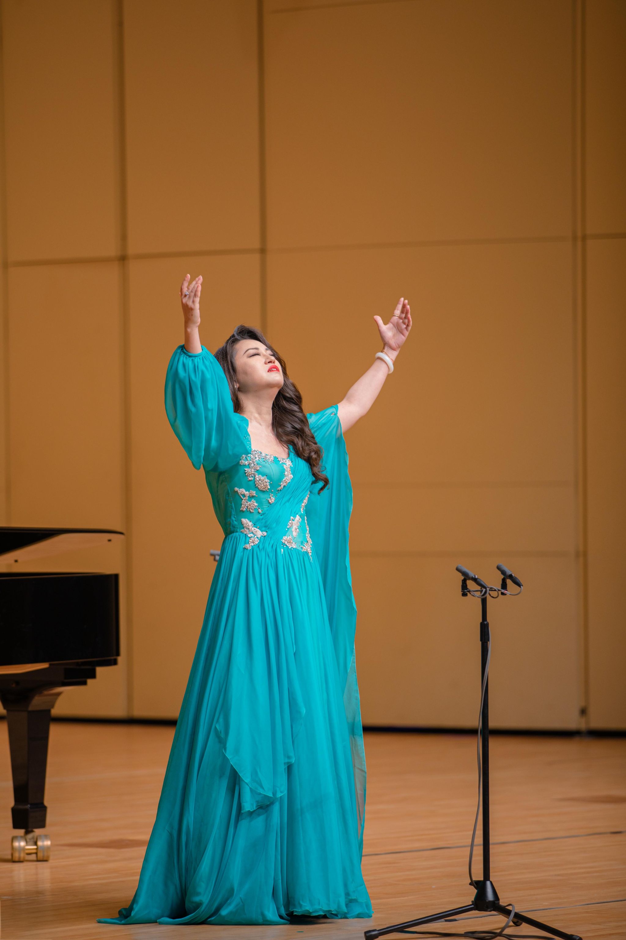 随后,蒲飞鸰老师演唱的《鸟儿在风中歌唱》以其清新的旋律,让观众仿佛置身于大自然的怀抱中。李思琦老师带来的一首毛泽东诗词《沁园春·雪》,她用豪迈的歌声描绘了一幅壮丽的山河雪景图。