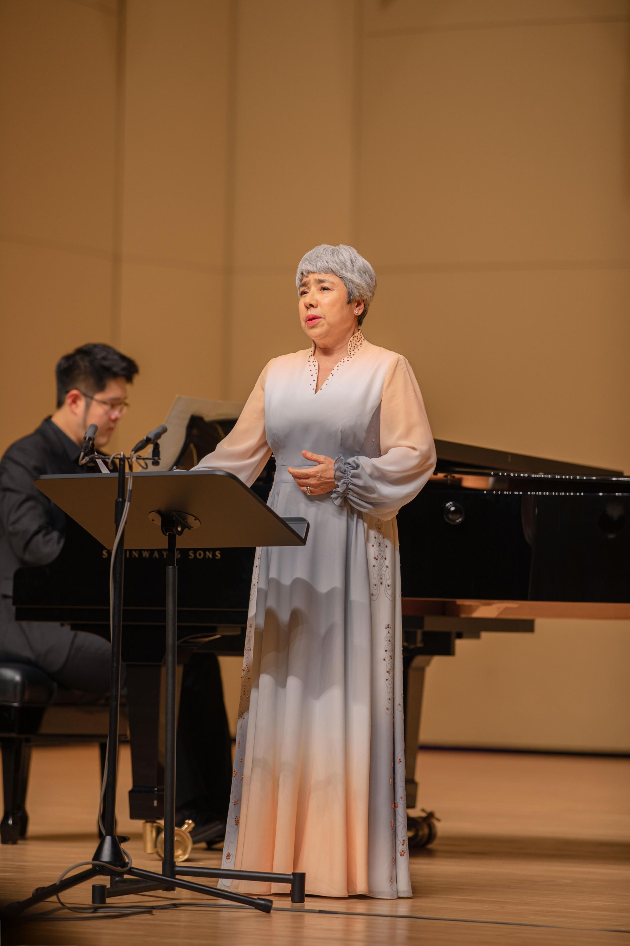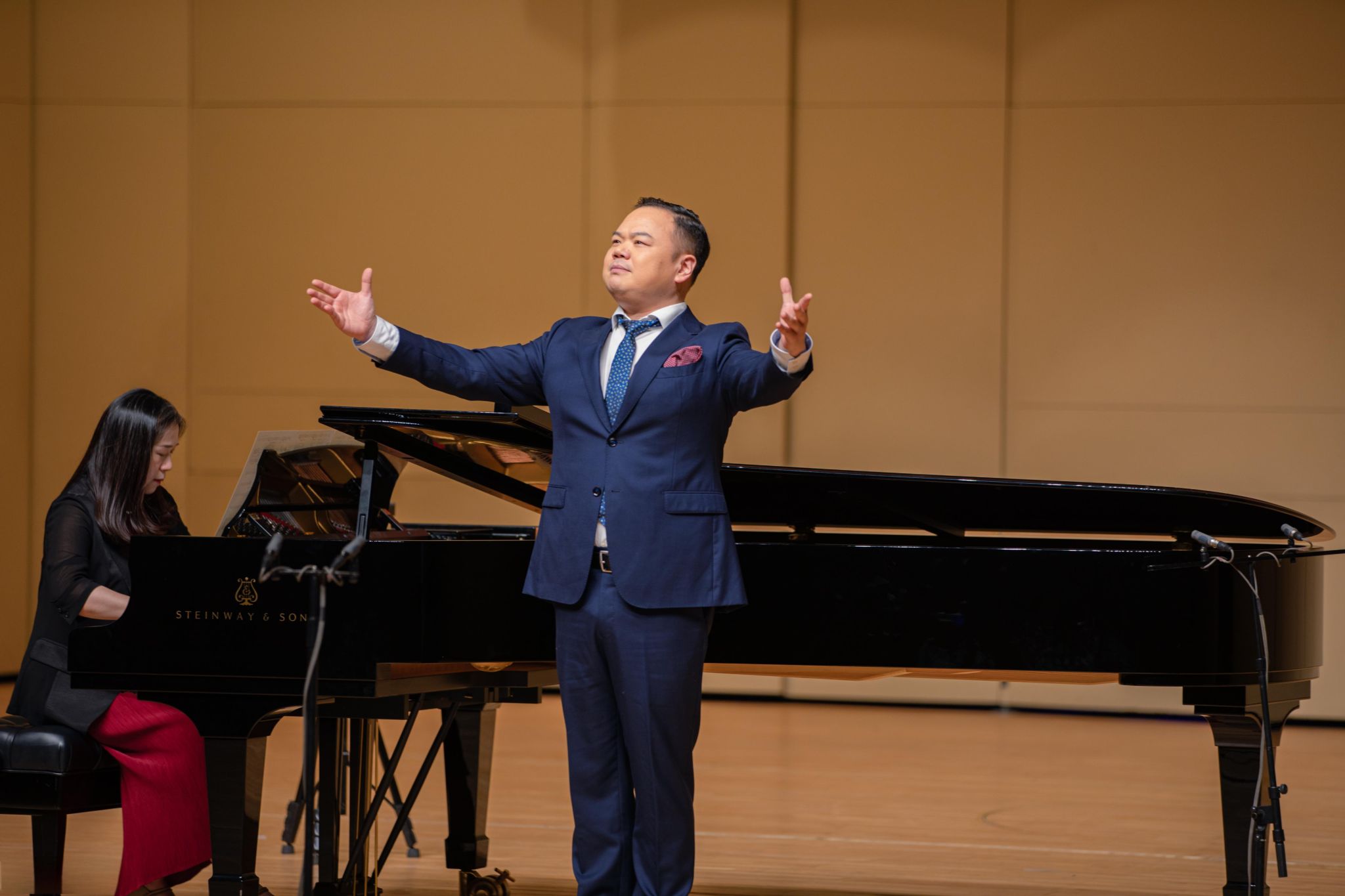 上半场,观众们还沉浸在诉说和温情的歌声中,仿佛将观众带入到那个激情燃烧的岁月。下半场一开始,张文巍老师就以其浑厚磁性的男低音完美演绎《我的祖国妈妈》,将现场氛围烘托到新的高度,随后又一经典的爱国歌曲《我爱你中国》由袁晨星老师演唱,华美的嗓音、真挚的情感和流淌的旋律交织在一起,对祖国的无限感激与深沉热爱依稀可见。