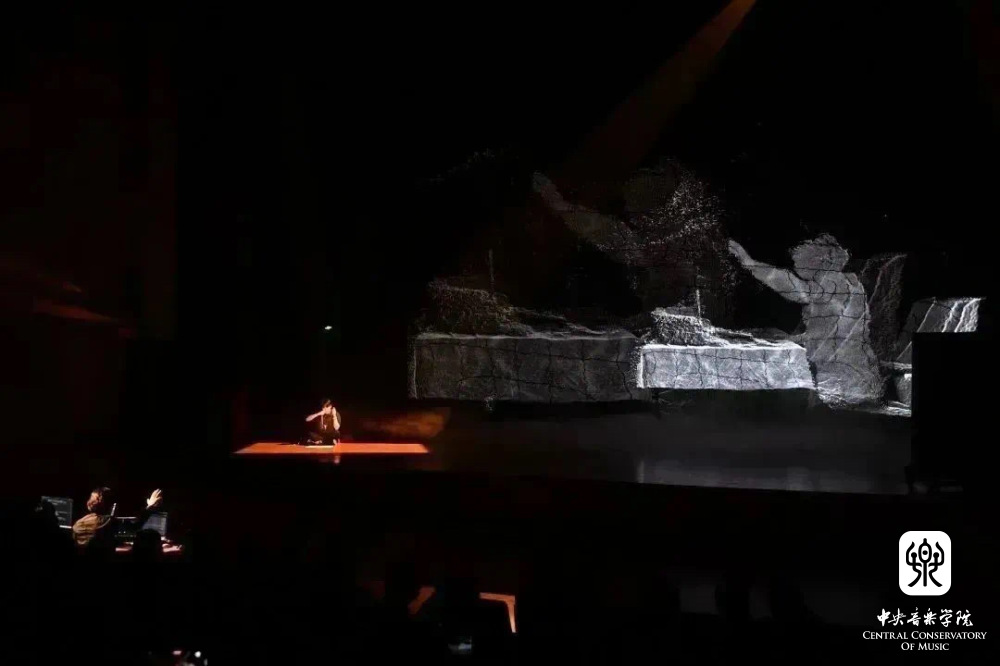 第四首作品,是栾家作曲的《< 厄>之二 ——司岗》 ——“得”“铃”“口弦”与电子音乐的多维对话。这首作品是一首由少数民族民间乐器与电子音乐相融合的作品。在标题中,厄是形意字,本身有困苦之意,意为山下有一个曲卷的人。云南世居民族,多为同宗,并有高山崇拜的习俗。本作品为《厄》系列第二部,“司岗”在佤族语言中指原初之地的崖洞,祖先从这里走出并繁衍生息。作品采用佤族“得”“口弦”“铃”等民间乐器进行现场演奏,使用手势控制器与MPC对现场演奏的声音进行实时变形与重塑,并通过手机实时控制声音的现场三维位置移动。在作品开始前,李小兵教授介绍了演奏者徐申阳及导师俞峰校长、李伟教授的情况。他自豪地表示,音乐人工智能系近几年招收的都是复合型人才,以徐申阳为代表,个个都是“多面手”,同时具备深厚的工科背景和较高的艺术造诣。