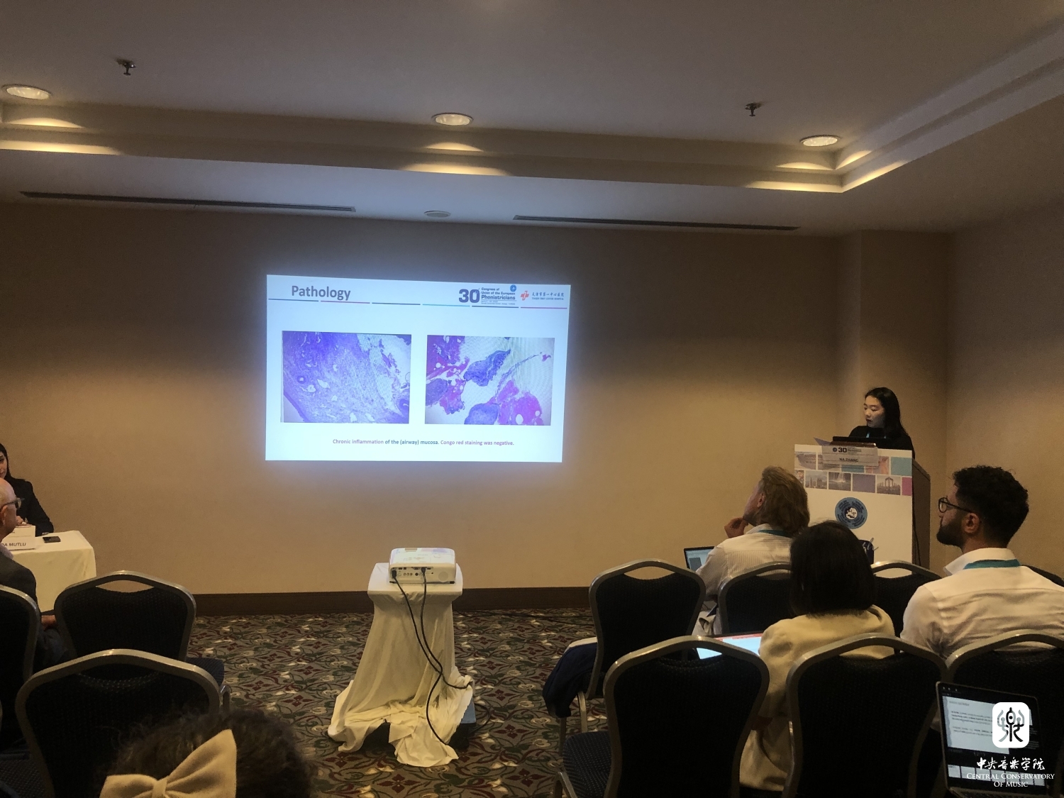 4月29日下午3时,米兰艺术嗓音及嗓音医学专业硕士研究生费丹棣同学代表天津市第一中心医院耳鼻咽喉头颈外科张娜医生在“言语研究论坛”(Research Forum:Speech)上进行了演讲,她通过对一个具体实例的剖析,阐述了复发性多软骨炎的患病和治疗过程。她认为,对于复发性多软骨炎,需多学科会诊,共同寻找发病原因,不能将目光仅仅限制、停留在耳鼻喉科疾病的专诊范围上。要有全局的视野,具有全面的诊疗思维,除注意常规耳鼻喉科疾病外,关注耳鼻喉科疾病的全身表现及身体情况非常重要。此外,哈尔滨医科大学附属第二医院耳鼻咽喉头颈外科刘鸣教授在27日下午4时30分“嗓音研究论坛”(Research Forum—Voice)上进行了针对双侧声带麻痹杓状软骨切除术的演讲,南方科技大学艺术中心毕宝仪教授也在“专题讨论会”上作了精彩发言。